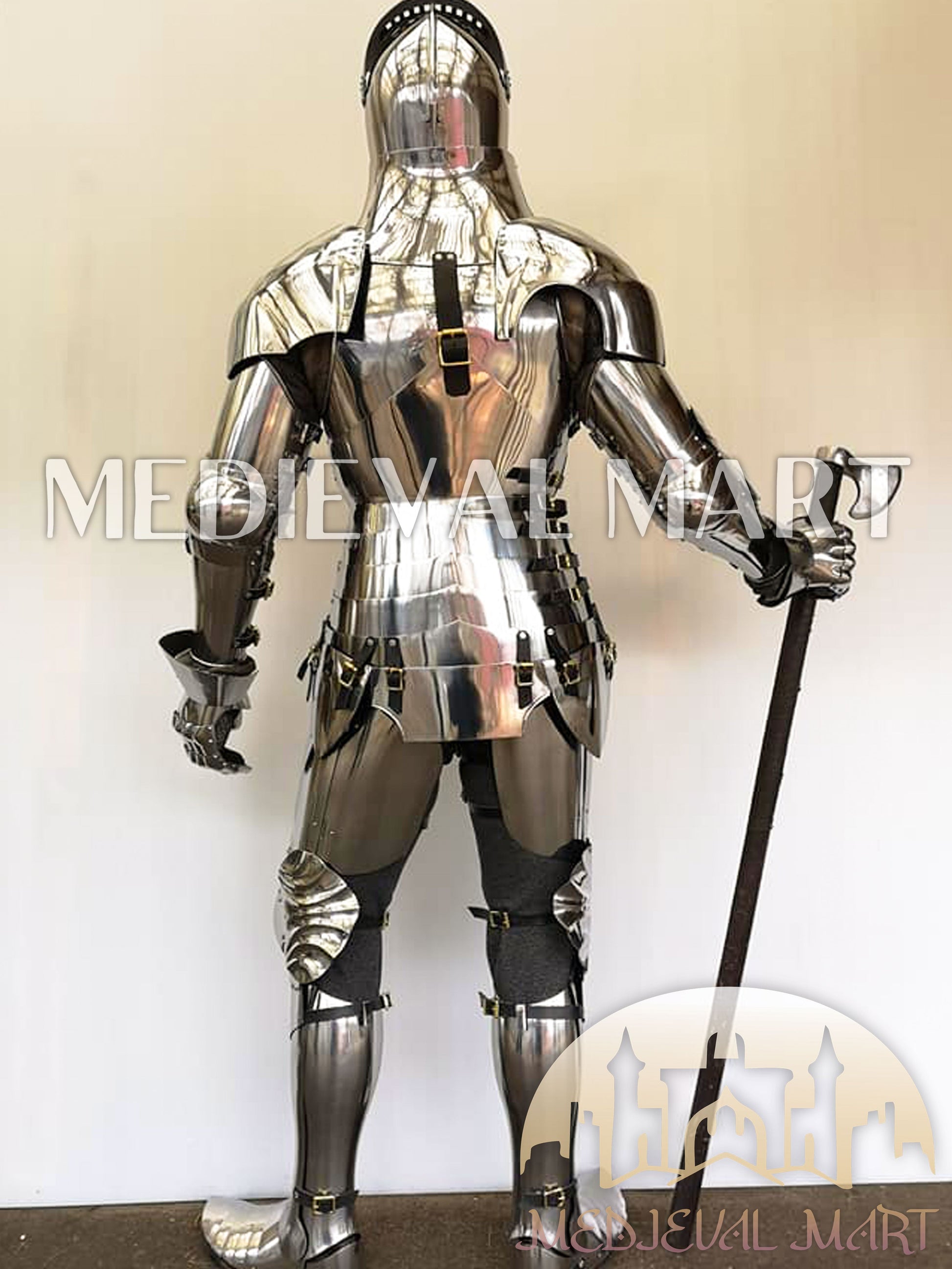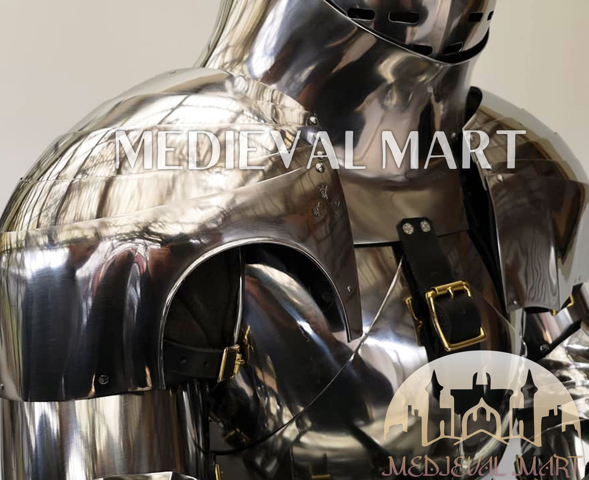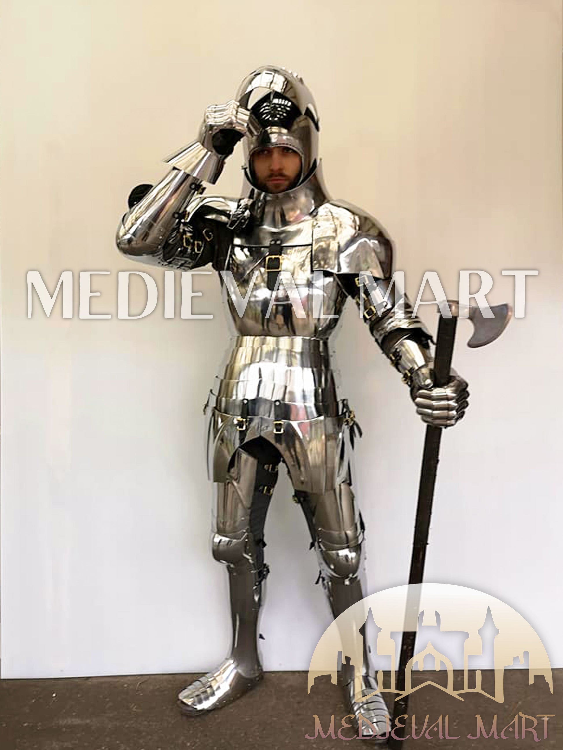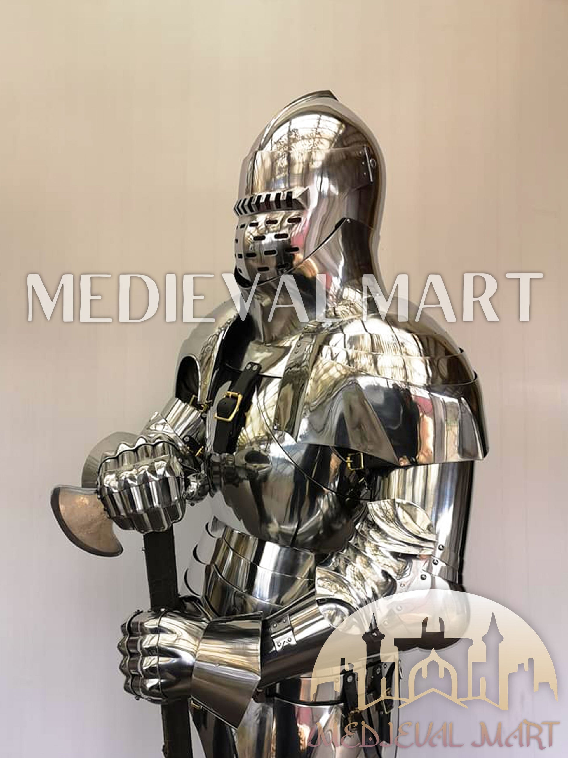 Forgez votre légende avec l’armure complète de chevalier médiéval anglais personnalisée MEDIEVALMART, une création magistrale conçue pour incarner puissance, prestige et autorité. Inspirée des armures anglaises traditionnelles, cette armure intégrale en plaques offre un équilibre parfait entre authenticité historique et personnalisation audacieuse — accompagnée d’une redoutable hache de style viking pour une présence guerrière renforcée.