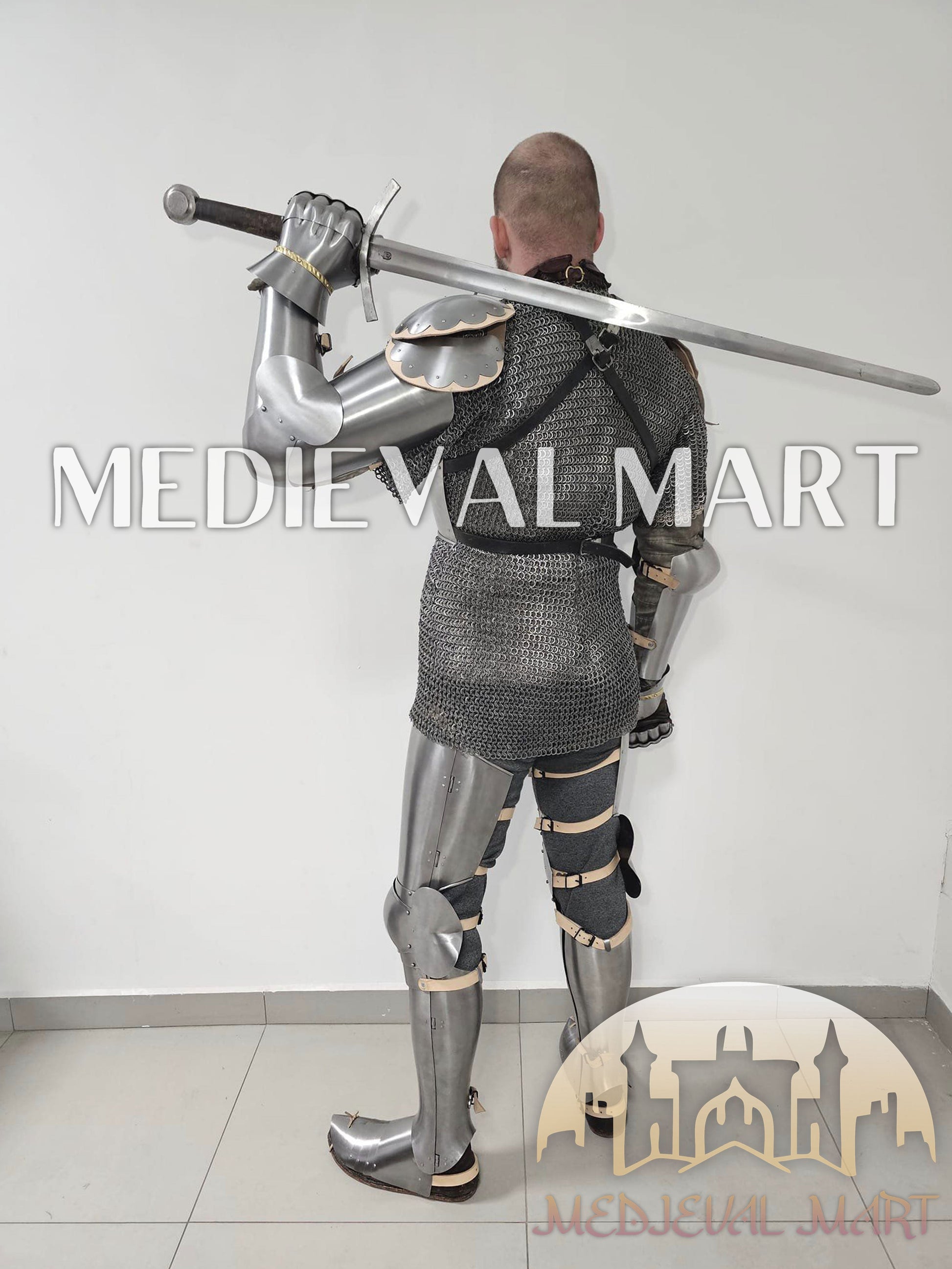 Chaque élément — du casque et du plastron aux grèves et gantelets — est pensé pour offrir mobilité, protection et présence visuelle impressionnante. La cotte de mailles incluse renforce la protection intérieure, exactement comme les chevaliers la portaient sous leurs plaques. Sur le champ de bataille comme en exposition, cette armure rend un hommage puissant à l’art de la guerre du XIVᵉ siècle.