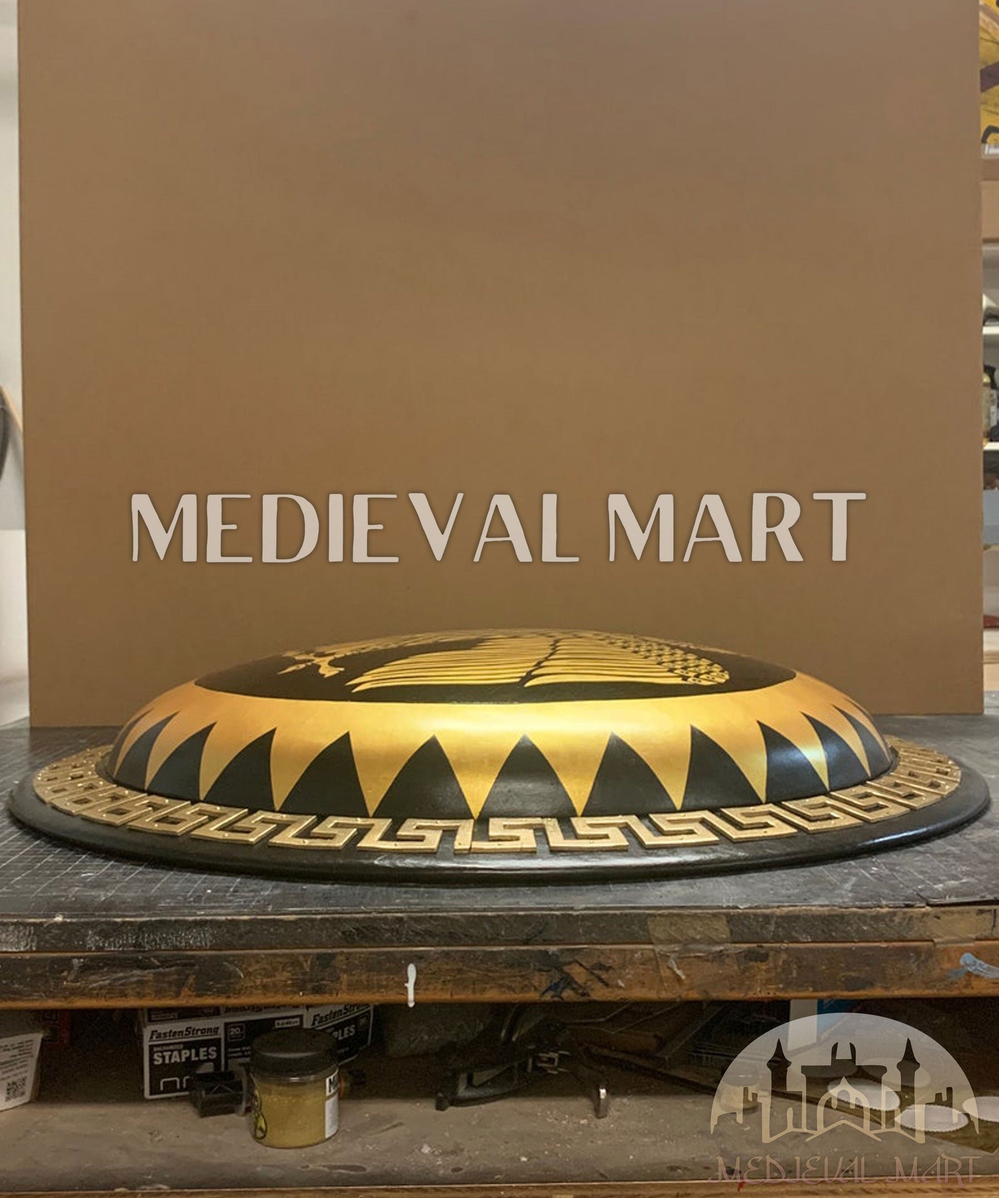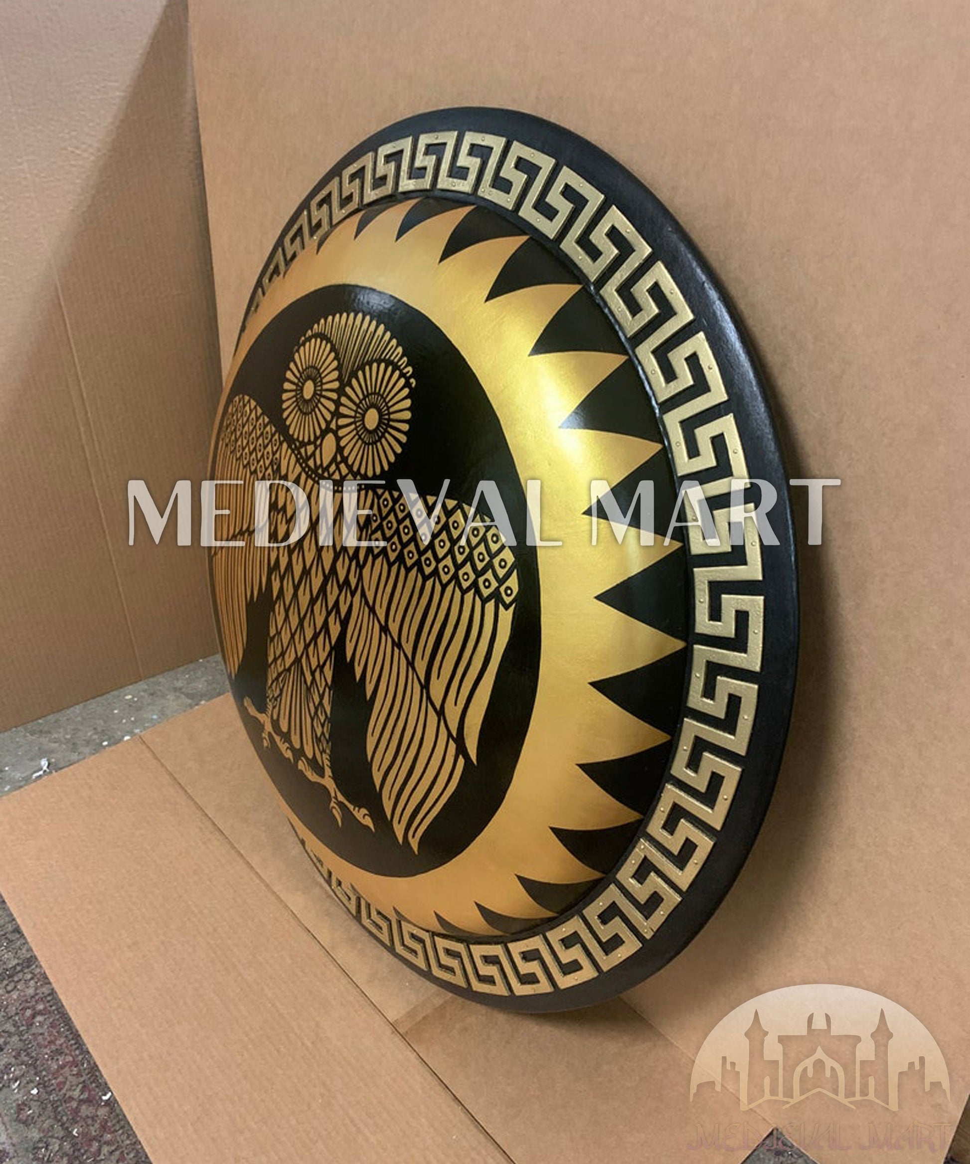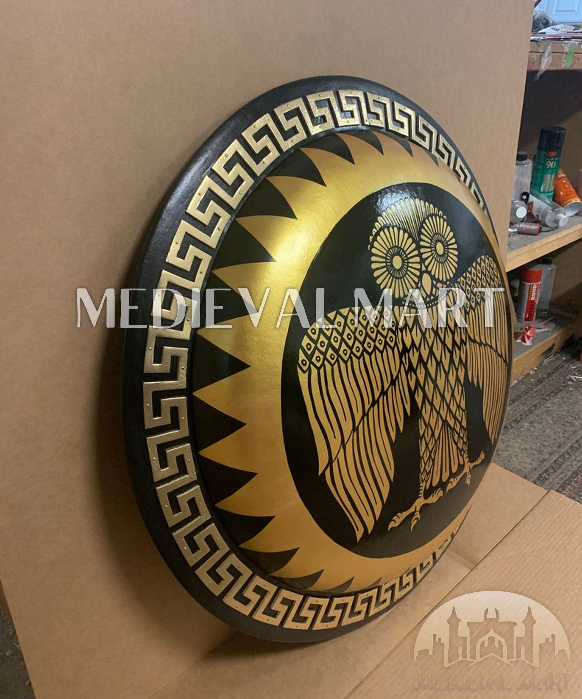 La chouette d’Athéna, symbole de sagesse et de savoir, est fidèlement reproduite à partir de motifs retrouvés sur des vases grecs antiques exposés dans des musées tels que le MET de New York et ceux d’Athènes. Le rebord du bouclier est également recouvert de cuir et orné d’un motif grec en relief, avec une finition dorée métallique brillante. L’arrière du bouclier est doublé de feutre noir, équipé d’un protège-bras en laiton poli, ainsi que de cordons rouges avec pampilles, assurant une finition luxueuse et authentique.