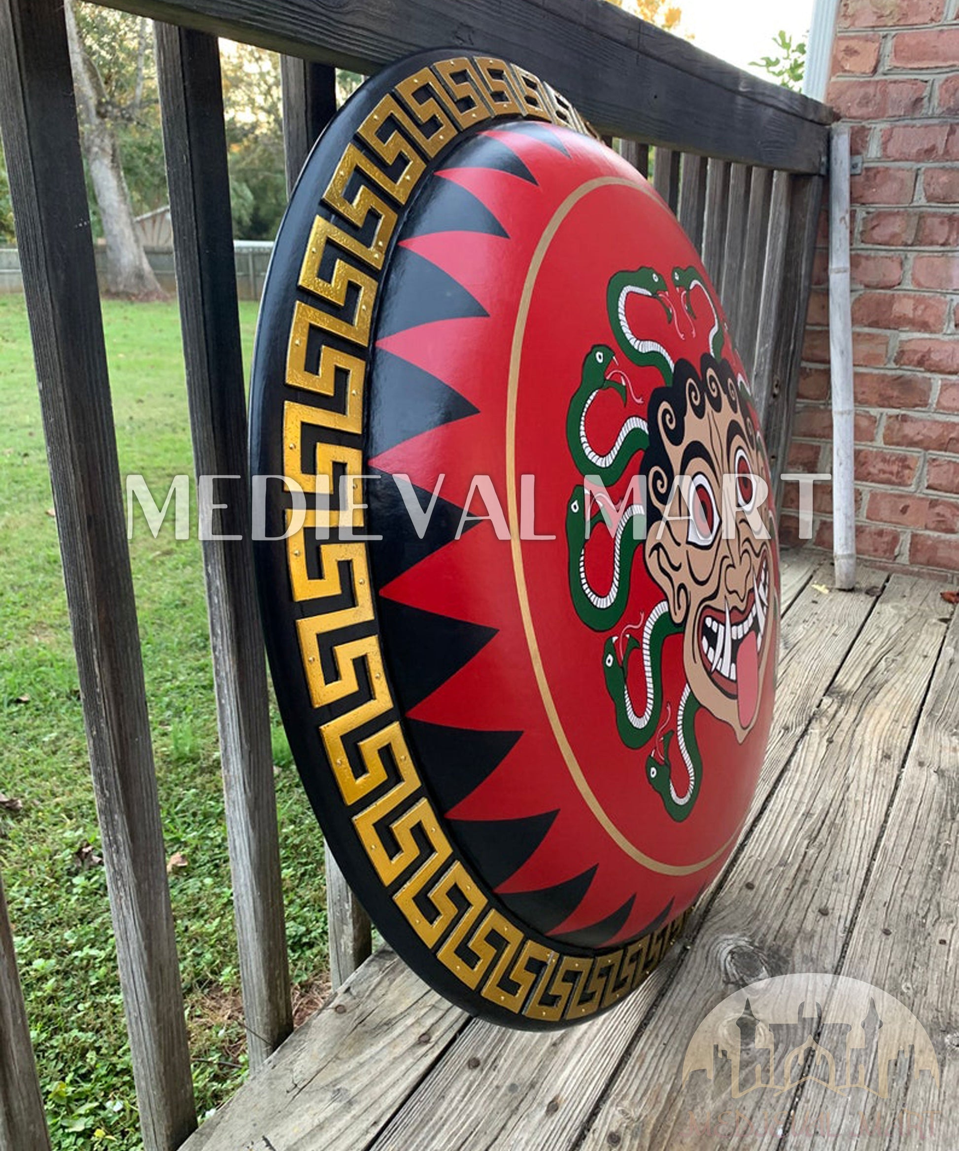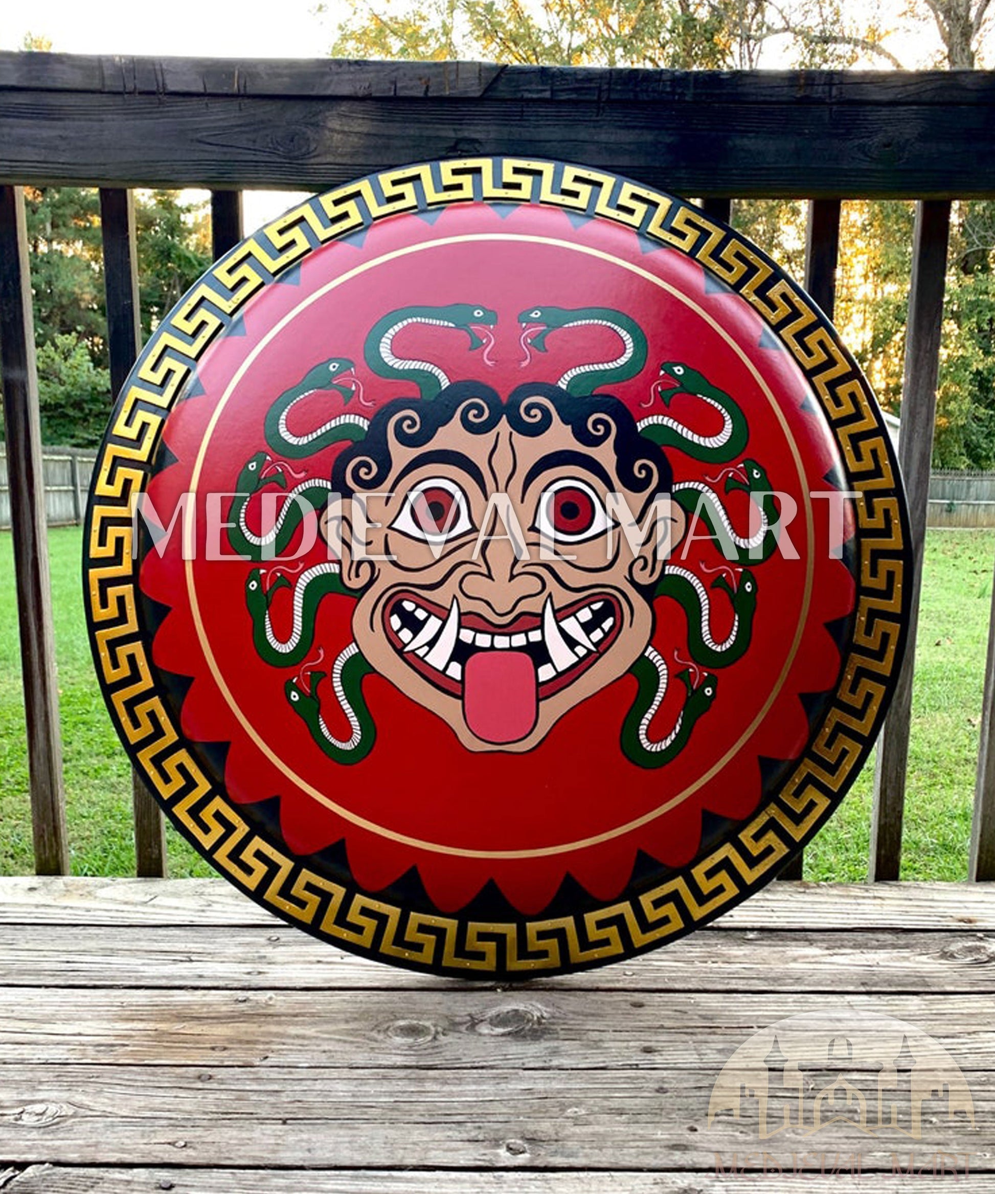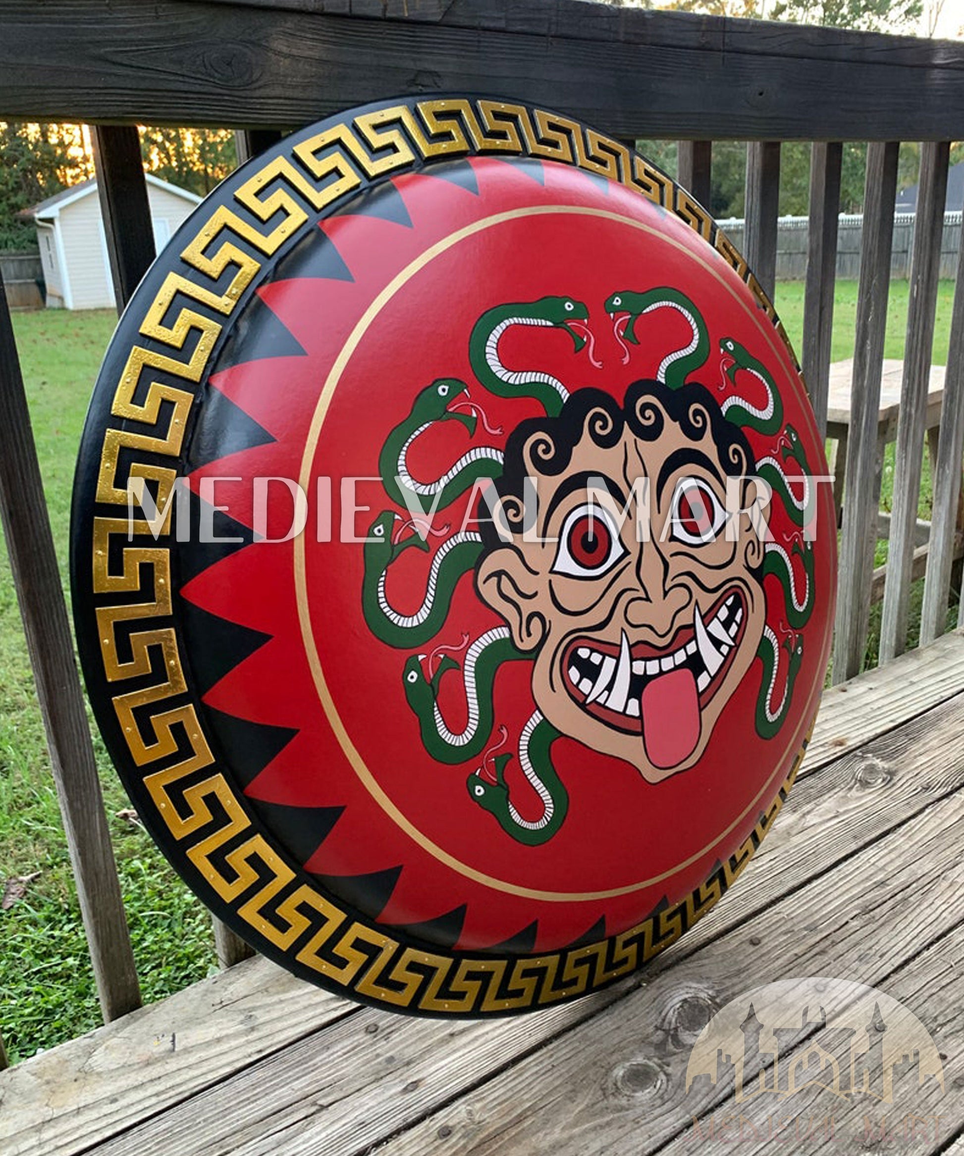 Inspiré de la légendaire Gorgone Méduse, dont le regard pouvait transformer ses ennemis en pierre, ce bouclier incarne la puissance et le mystère de la mythologie grecque. Fabriqué en métal et laiton durables, il présente une finition usée par le combat qui lui confère profondeur, caractère et authenticité. Le motif détaillé de Méduse au centre du bouclier symbolise la protection, la force et la puissance mystique, tout en évoquant l’héritage des hoplites grecs.