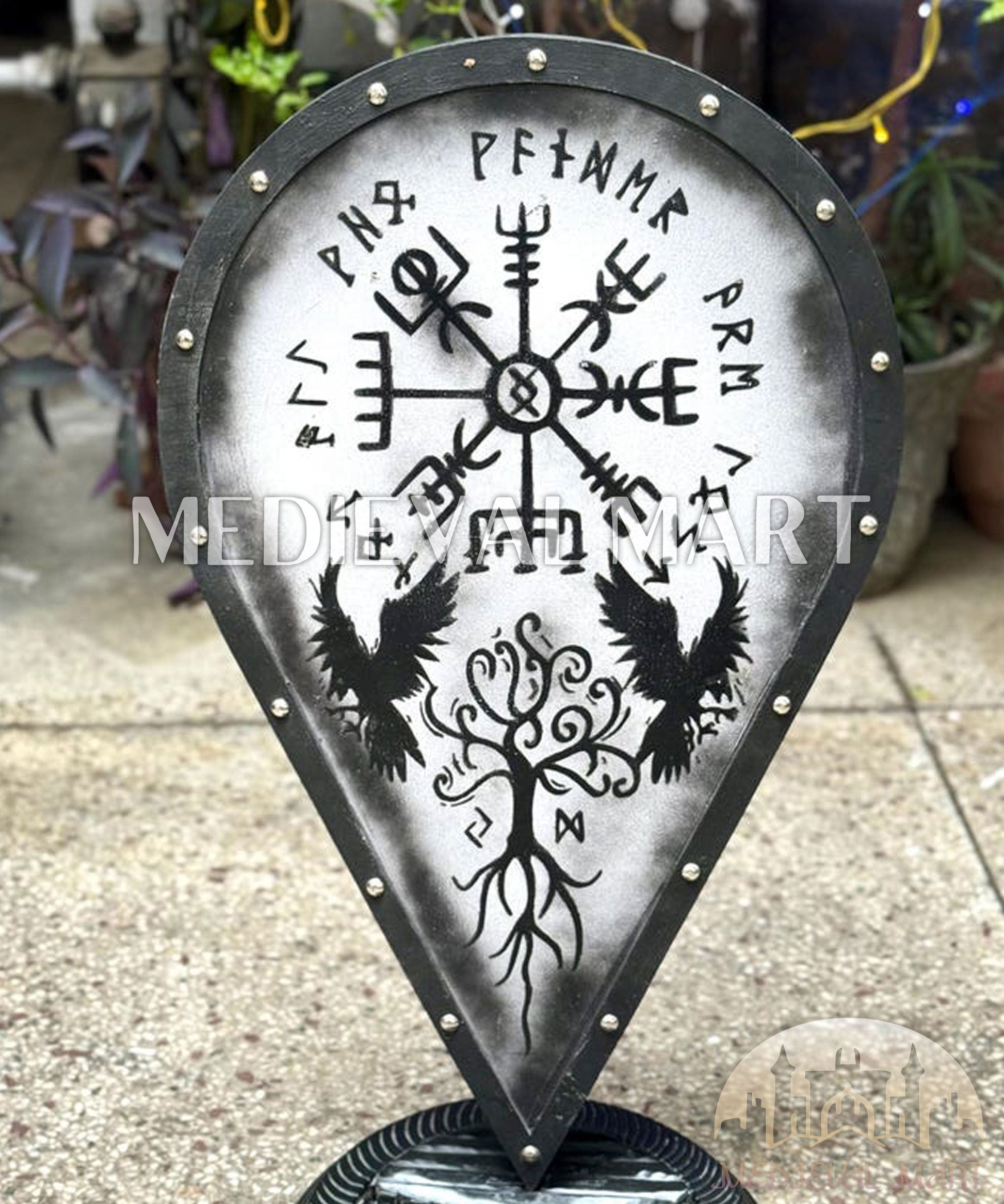 Le bouclier viking Vegvísir MEDIEVALMART, orné du compas Vegvísir, de l’arbre de vie Yggdrasil et des corbeaux d’Odin, incarne la puissance de la mythologie nordique. Conçu pour les passionnés de Vikings et de légendes anciennes, ce bouclier est idéal pour le cosplay, la décoration intérieure ou comme cadeau symbolique pour papa.