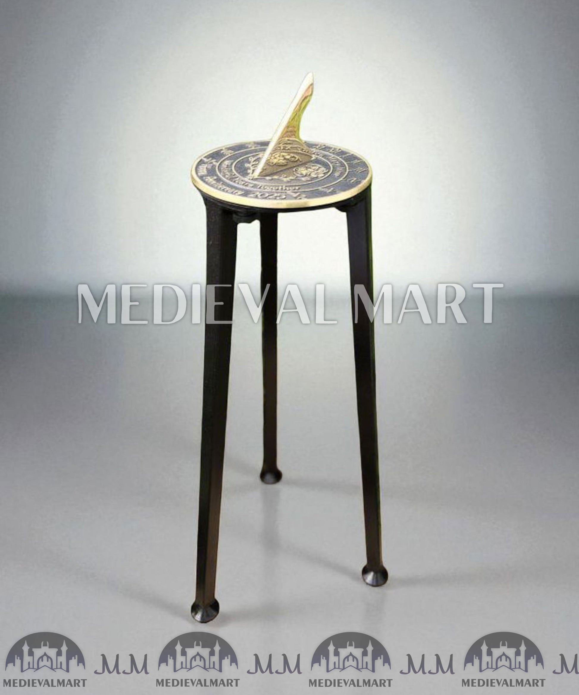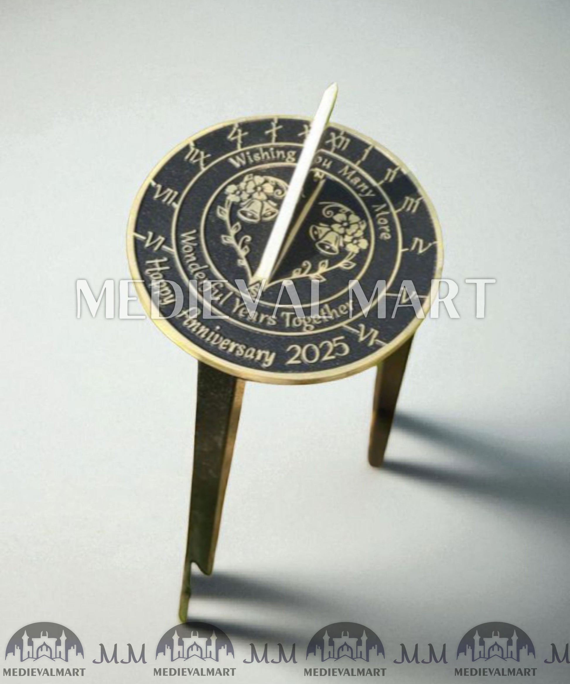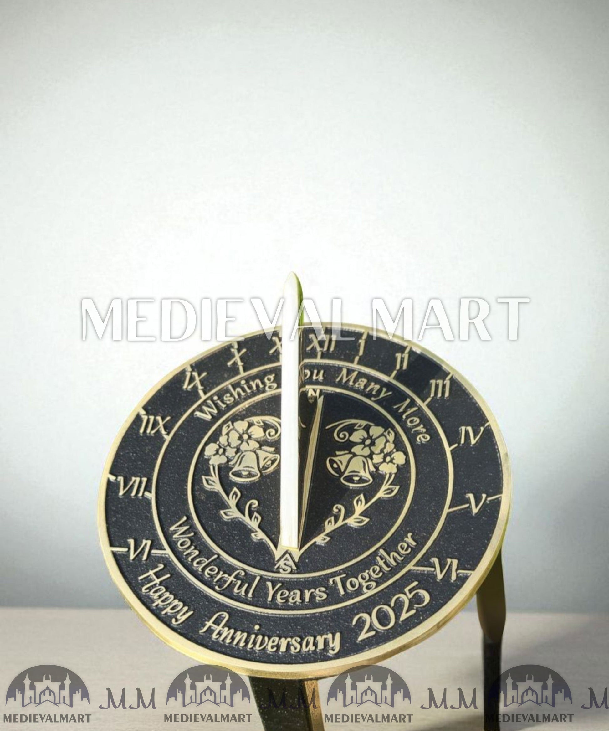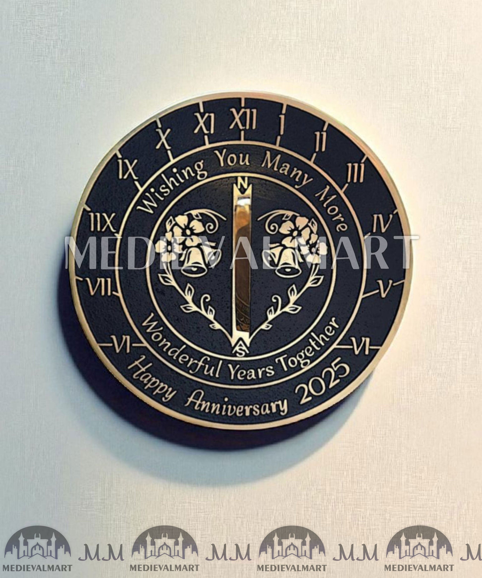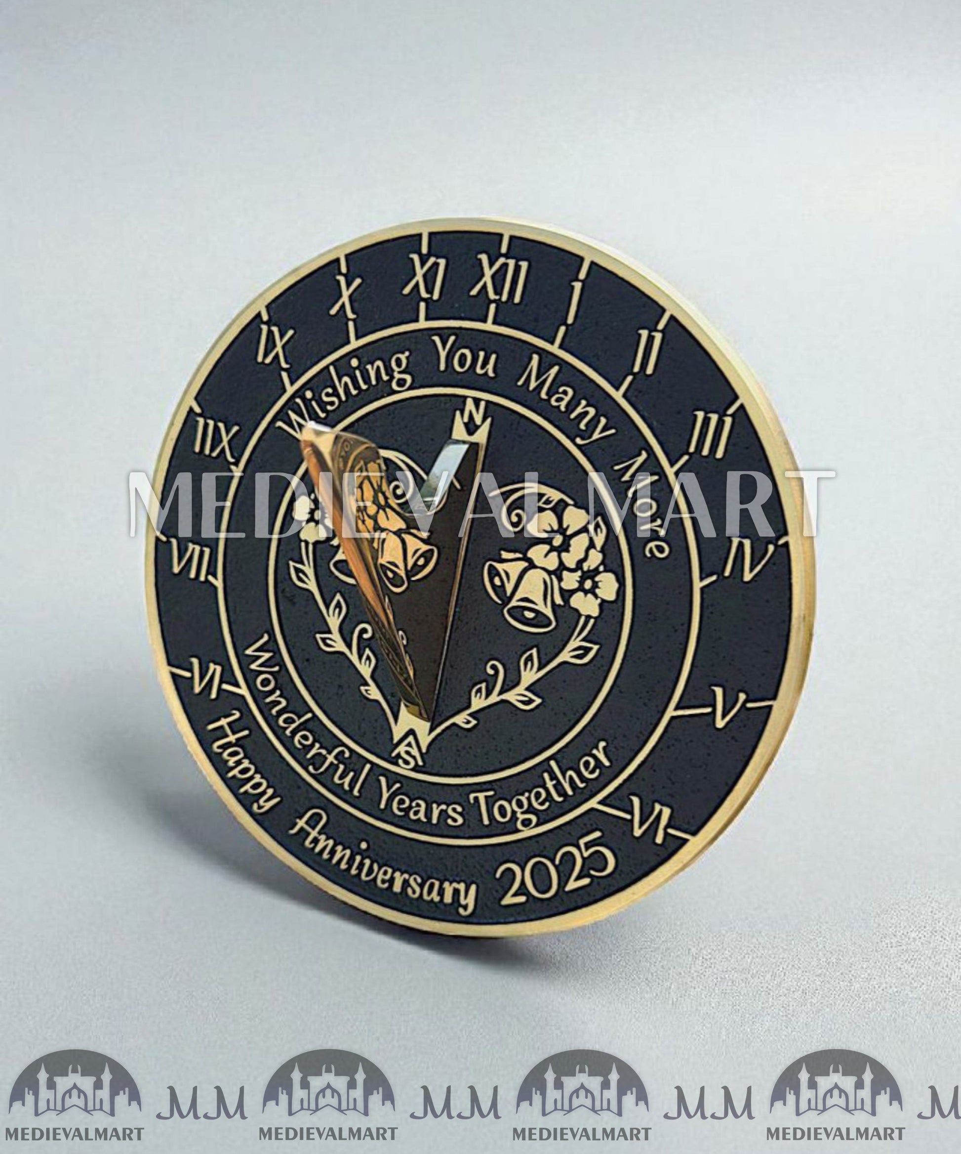 - As a finished product, the Golden Wedding Anniversary sundial has a raised brass border and text that are polished to a fine gold finish. The background is painted black and the whole sundial is lacquered to finish.