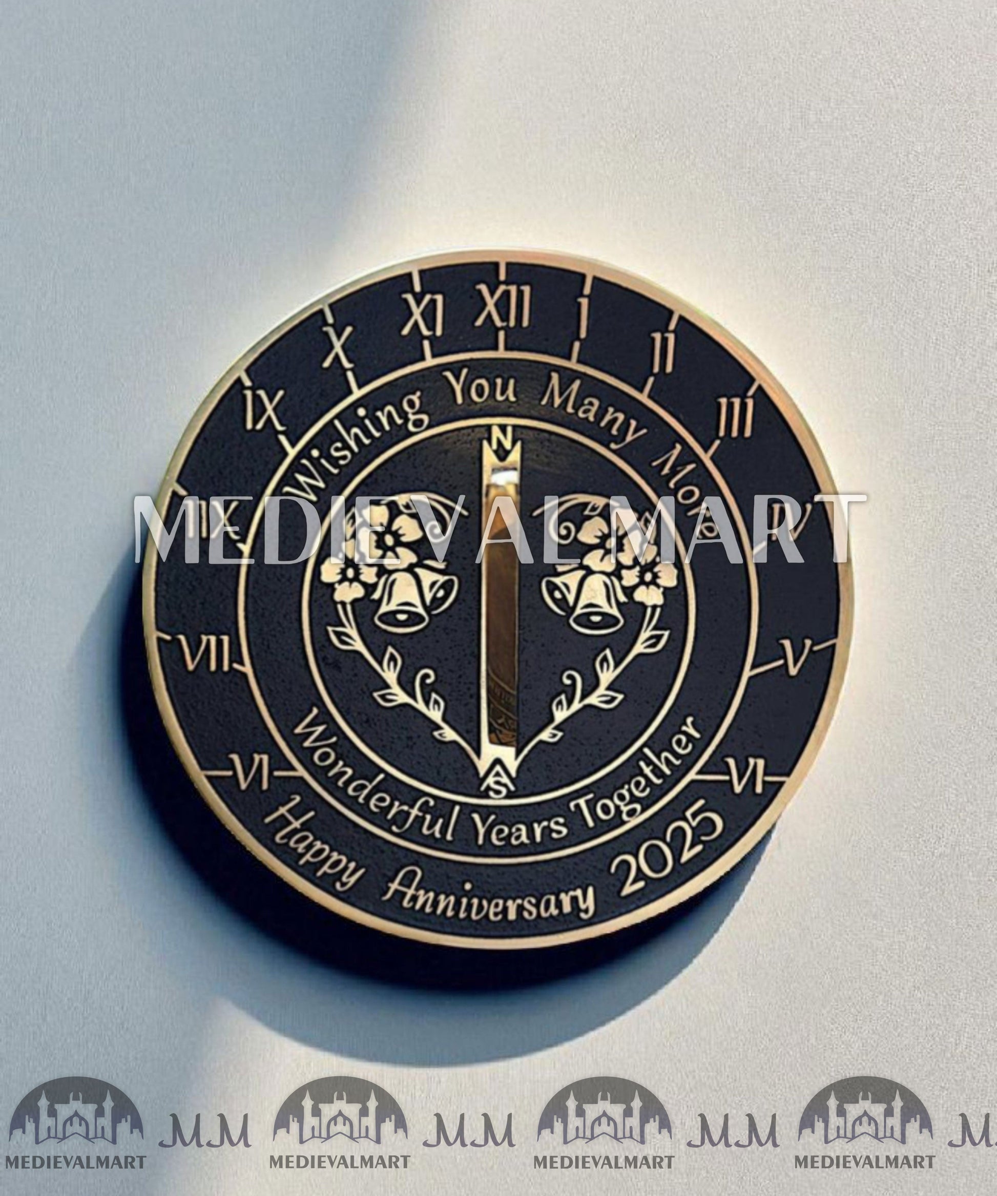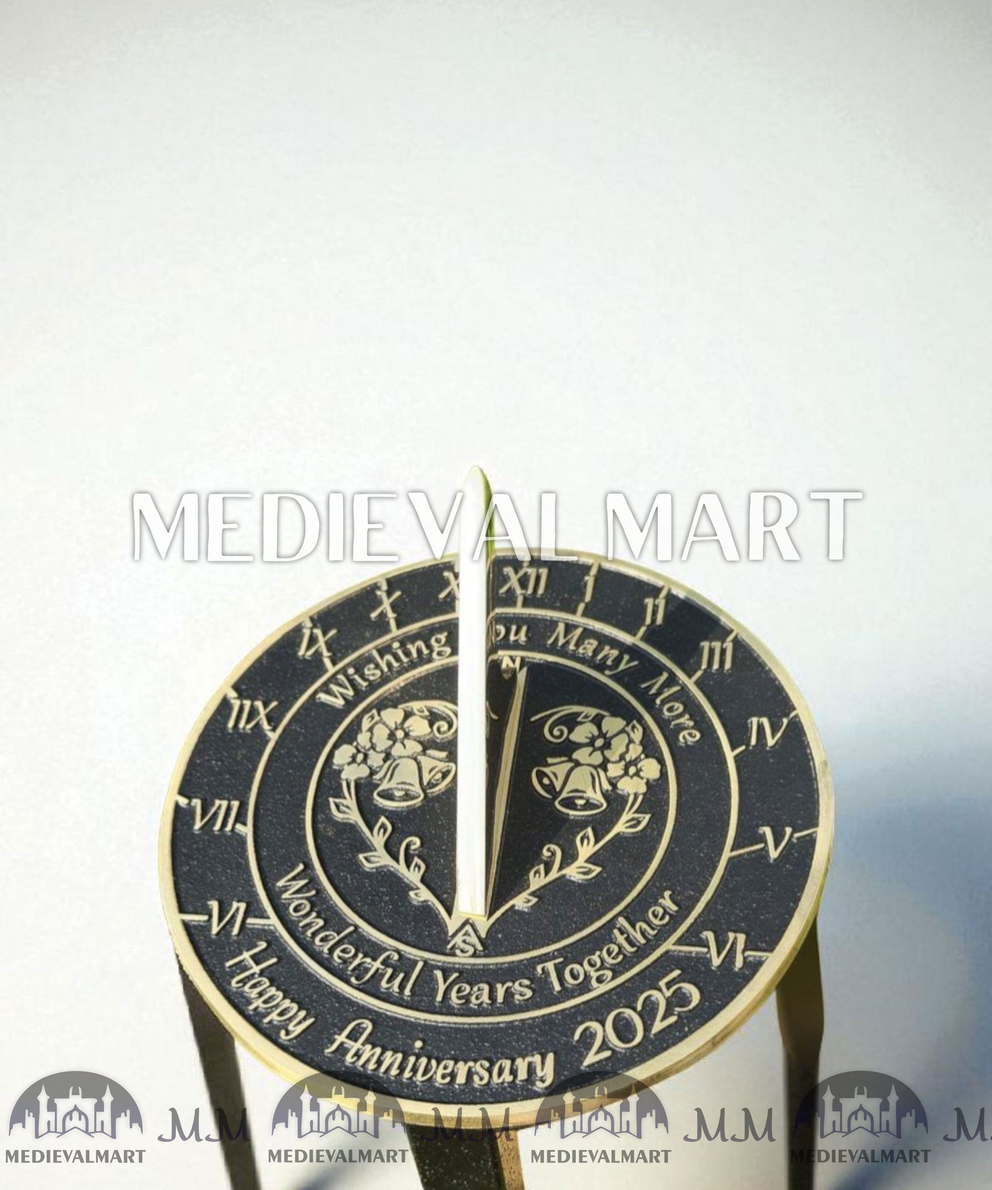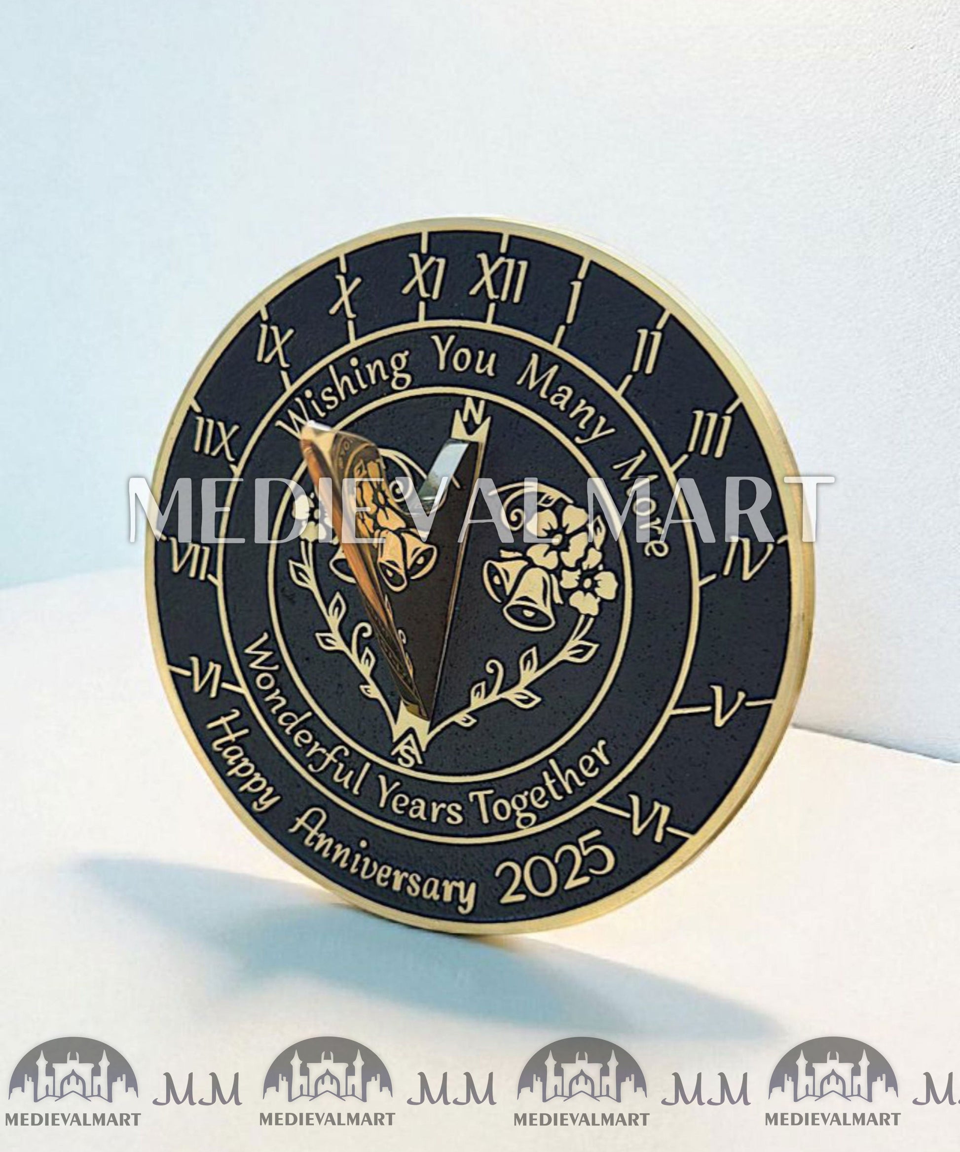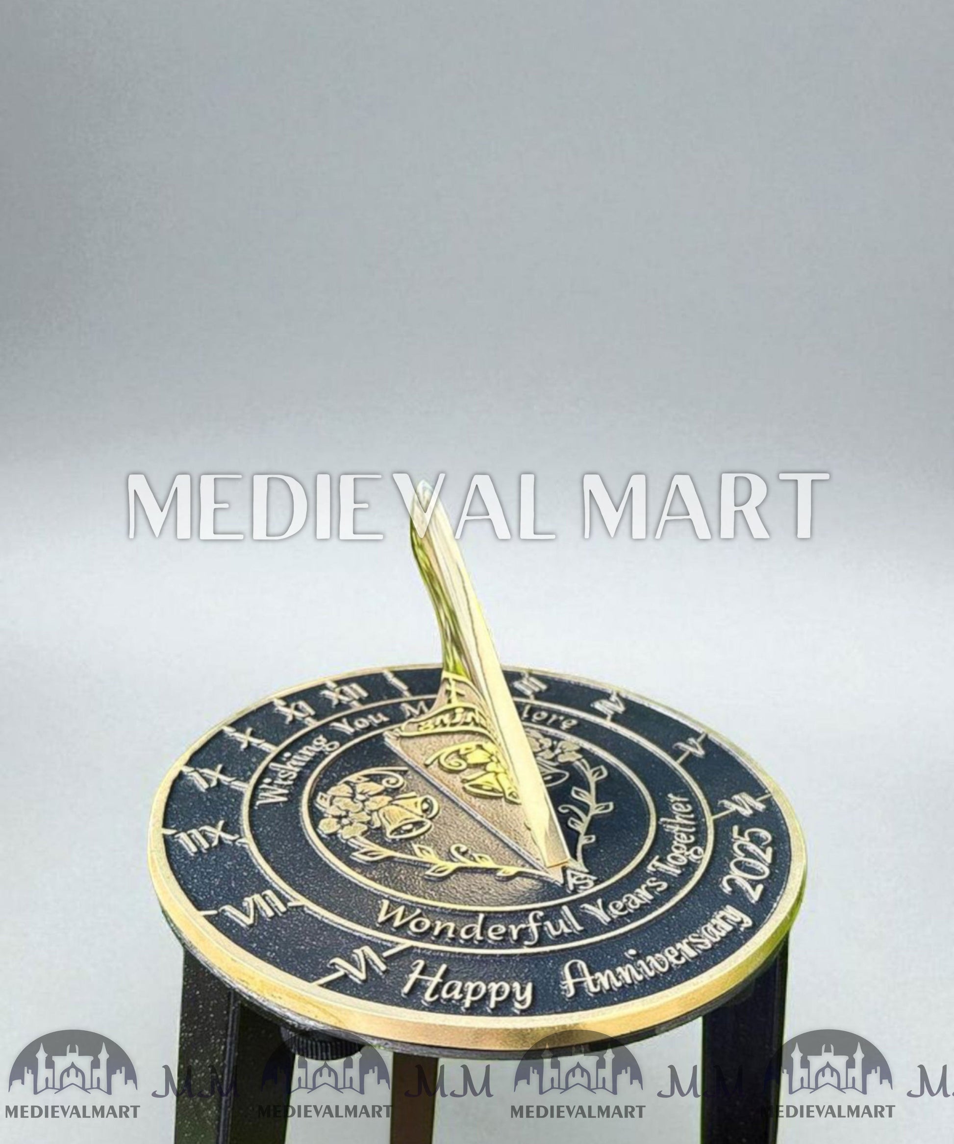 - As a finished product, the Golden Wedding Anniversary sundial has a raised brass border and text that are polished to a fine gold finish. The background is painted black and the whole sundial is lacquered to finish.