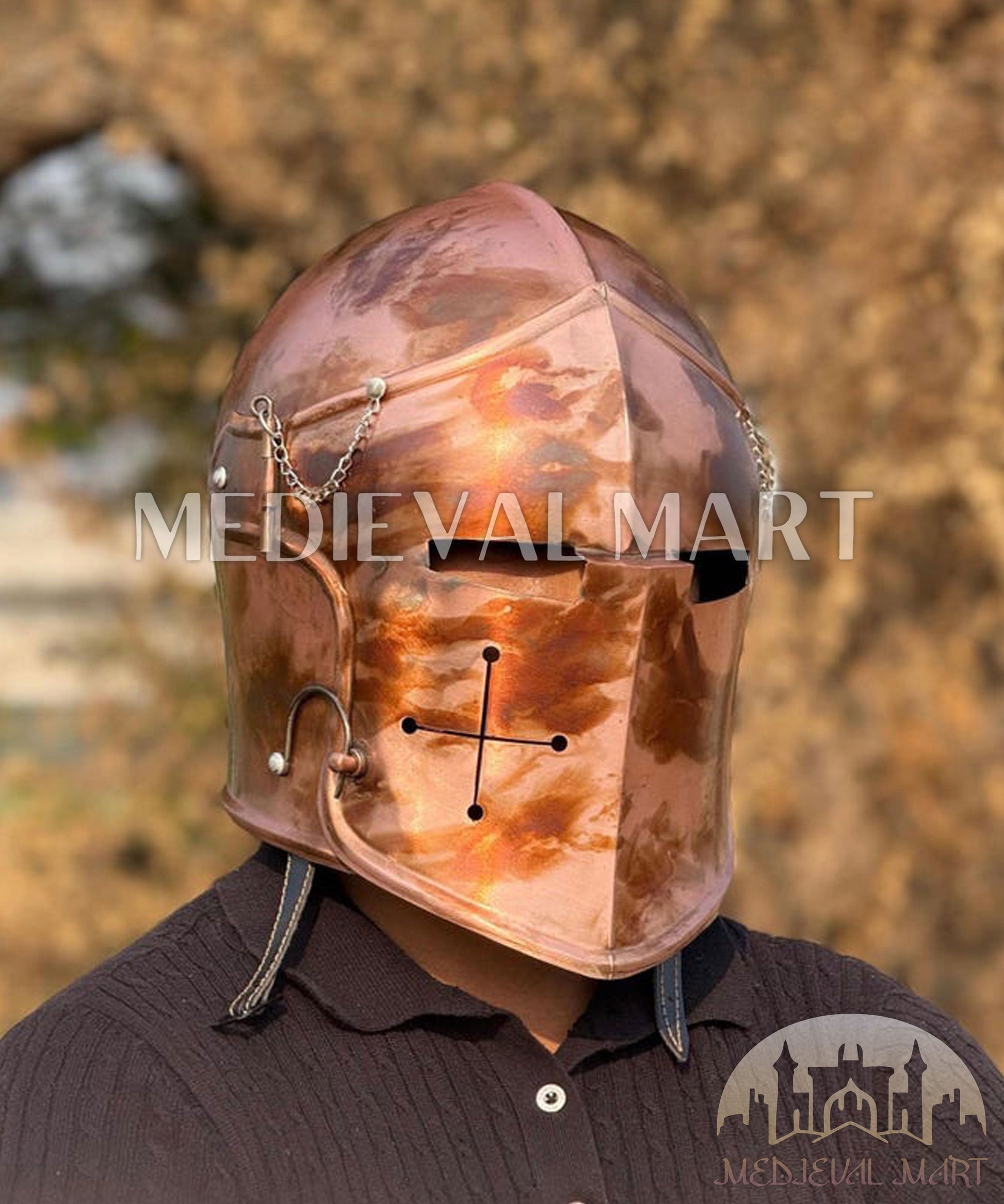 Casque Barbute Commando en Cuivre ~ Armure de chevalier médiéval en acier doux 18G ~ Casque de guerrier à visière pour LARP, cosplay et Halloween.