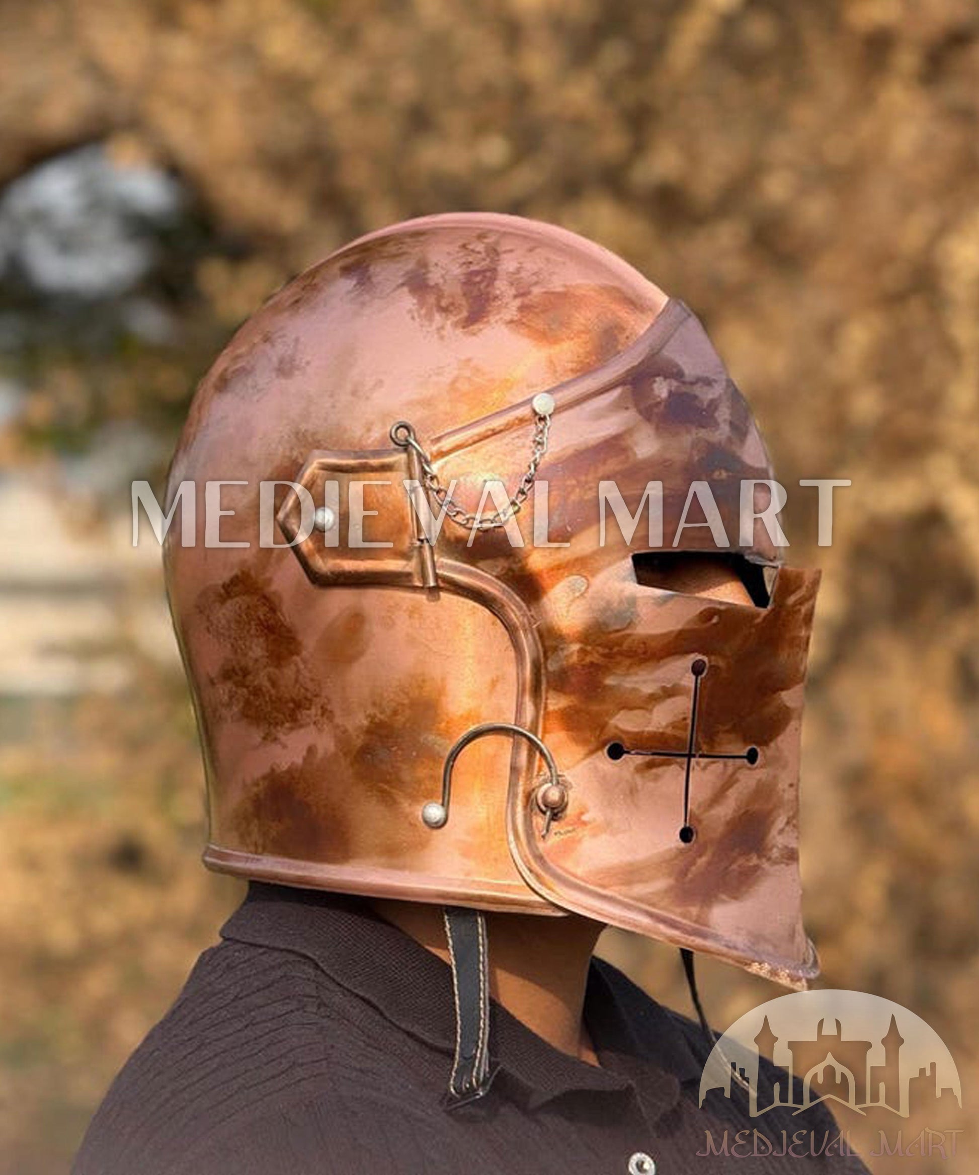 - Design : Design Barbute d’inspiration médiévale avec visière fonctionnelle pour une protection accrue du visage.