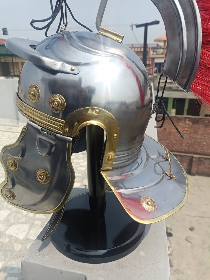 Ce casque de centurion impérial romain MEDIEVALMART est une pièce remarquable, conçue avec précision et respect de l’histoire. Fabriqué à la main par des artisans qualifiés, ce casque présente une structure robuste en acier avec de superbes ornements en laiton, incarnant l’autorité et la noblesse des commandants romains.