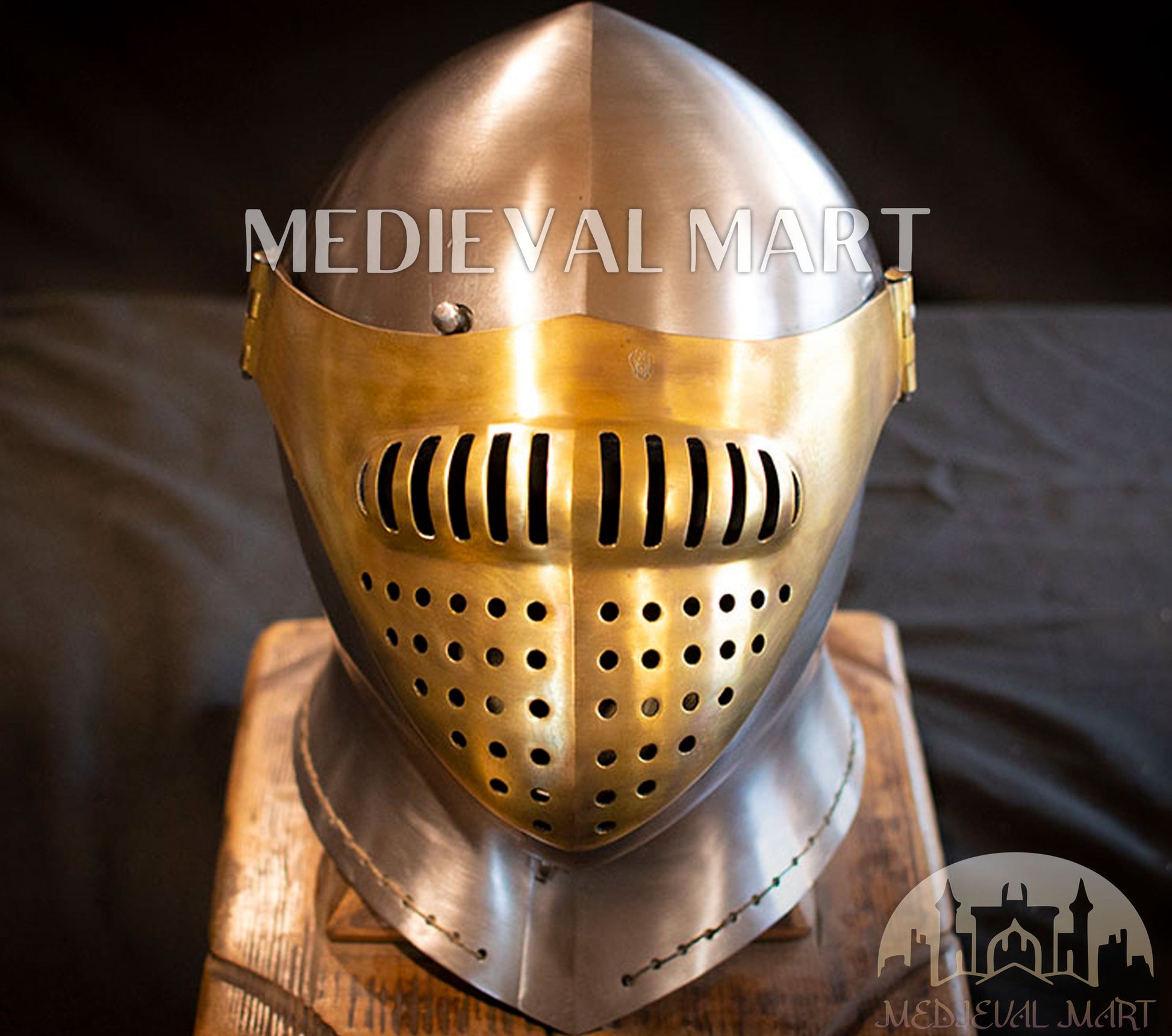 Revivez Les Champs De Bataille De La Grande-Bretagne Antique Avec Le Casque Bicoque Kasten-Brust Britannique MEDIEVALMART, Un Chef-D’Œuvre Forgé Pour Les Guerriers Qui Ne Craignent Rien. Ce Casque Évoque L’Héritage Des Chevaliers Qui Dominèrent Autrefois Le Champ De Bataille Par La Volonté Pure Et L’Acier Poli. Son Masque Facial Unique En Laiton Offre Non Seulement Une Protection Supplémentaire, Mais Ajoute Aussi Une Élégance Redoutable À Votre Présence — Un Véritable Symbole De Puissance Et De Prestige.