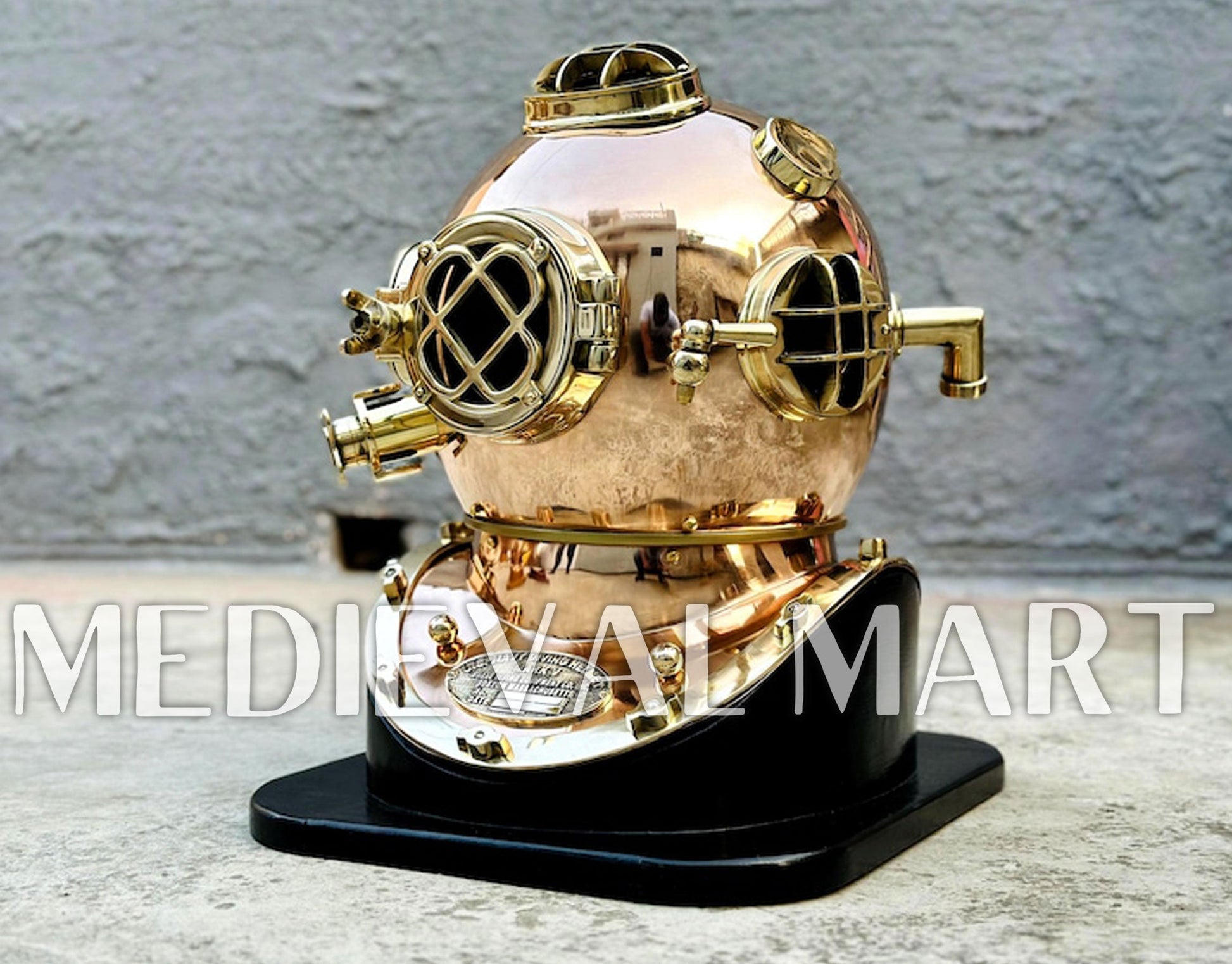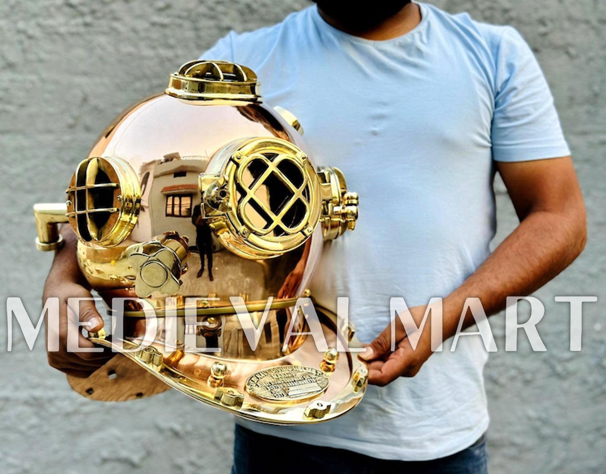 Le casque de plongée en cuivre et laiton pur MEDIEVALMART est une réplique magistrale des équipements traditionnels de plongée en haute mer. Entièrement fabriqué à partir de cuivre et de laiton premium, ce casque se distingue par sa finition polie éclatante et ses détails minutieux, reflétant l’authenticité et le prestige du monde maritime.