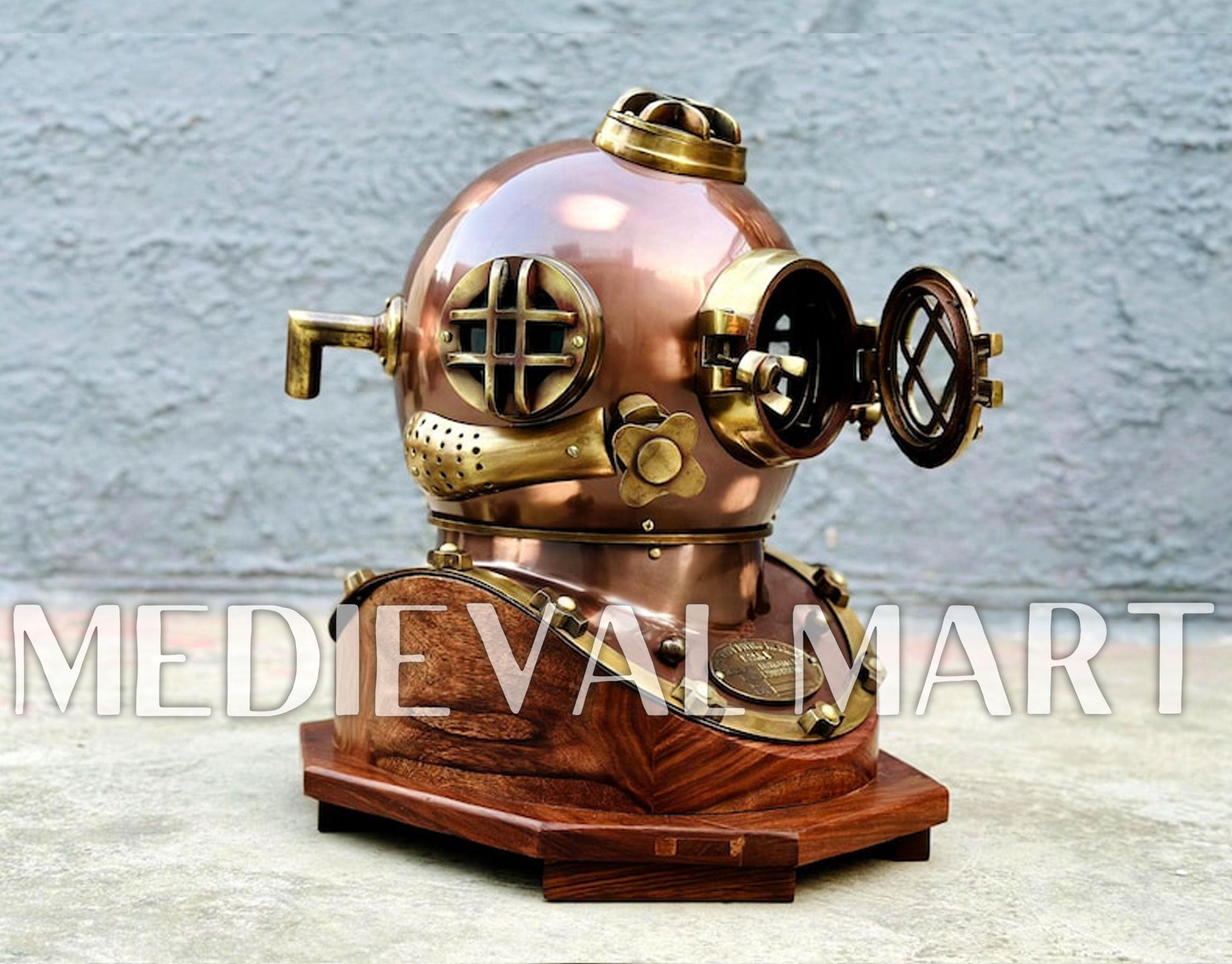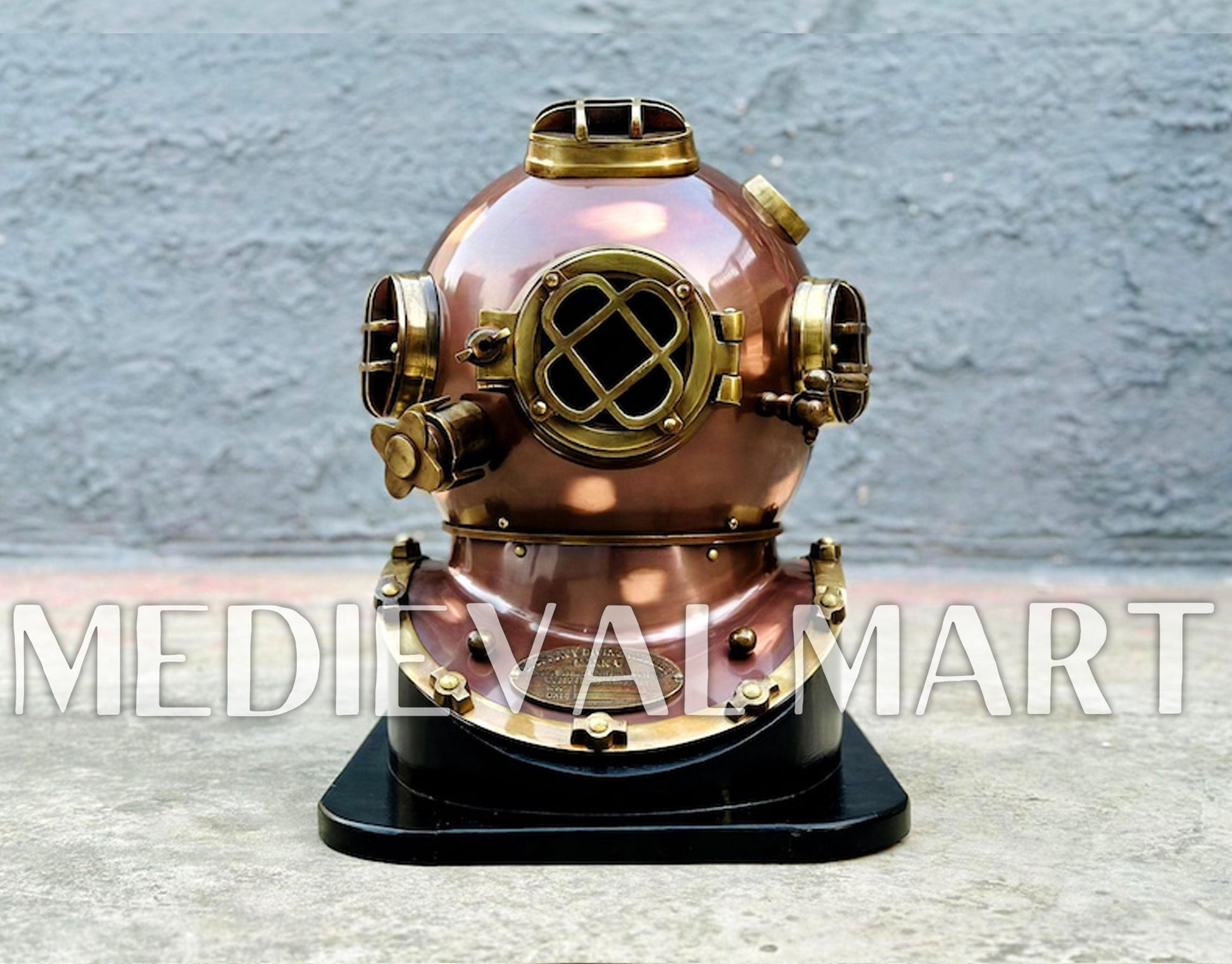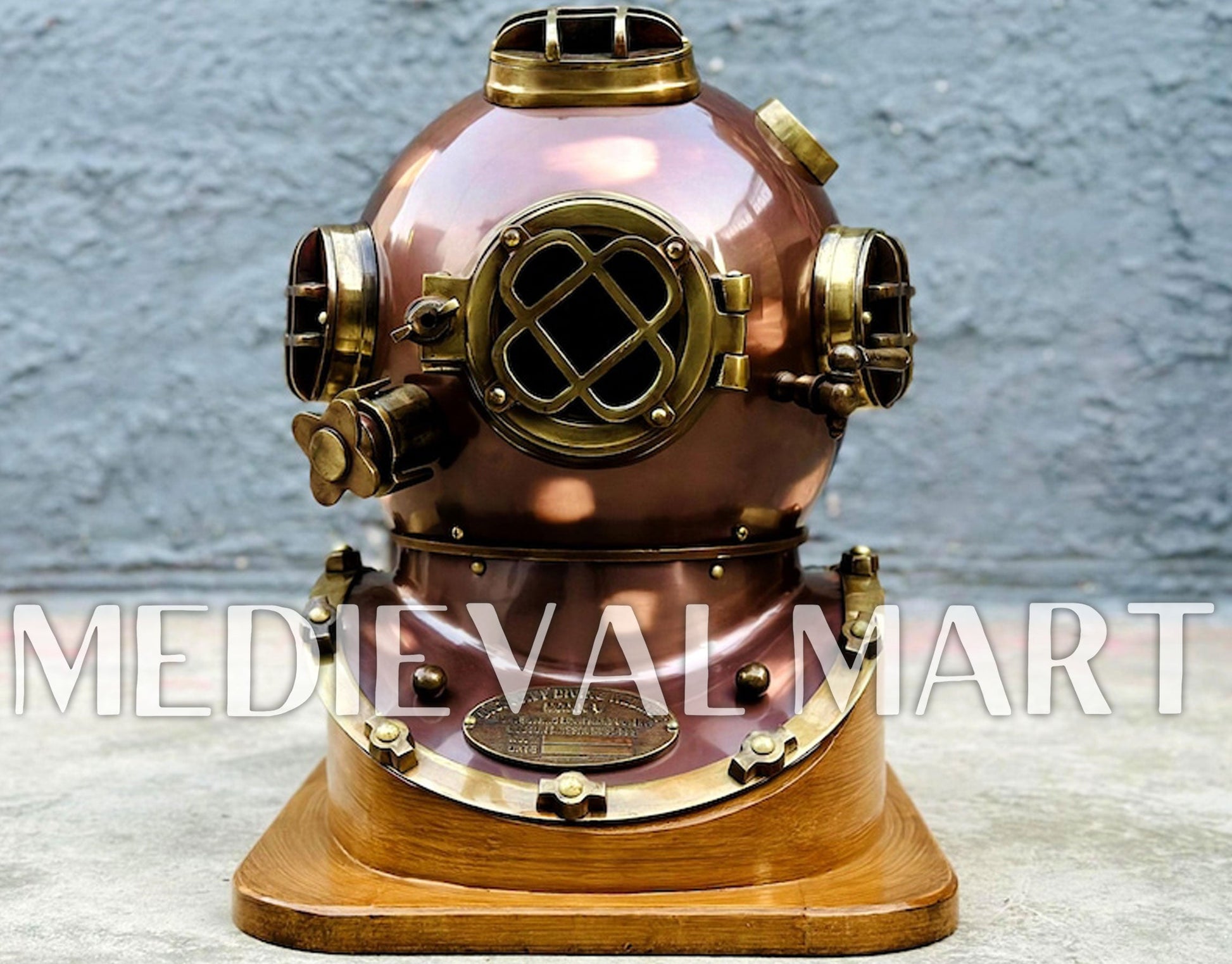 Conçu avec un grand souci du détail, ce casque repose sur un socle en bois solide, ce qui en fait une pièce décorative remarquable pour les intérieurs à thème maritime, les bureaux, les restaurants, les hôtels ou les collections privées.