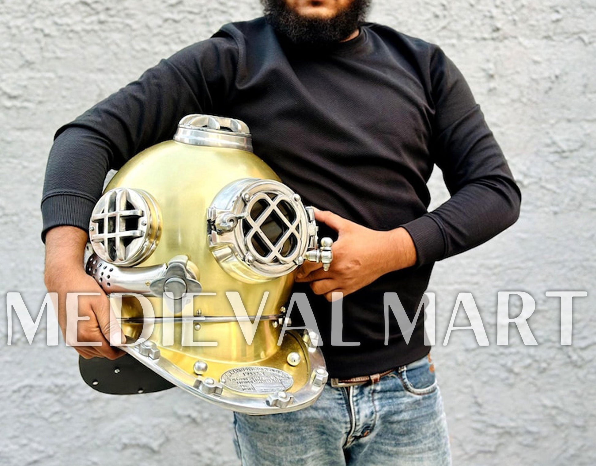 Le casque de plongée vert doré est un magnifique mélange de charme antique et de savoir-faire moderne. Doté d’une finition vert doré unique, ce casque de plongée de reproduction capture parfaitement l’essence de l’exploration sous-marine vintage. Fabriqué à la main avec des détails complexes et soignés, il est idéal pour les collectionneurs, les passionnés de nautisme, ou comme pièce maîtresse remarquable dans une décoration à thème maritime.