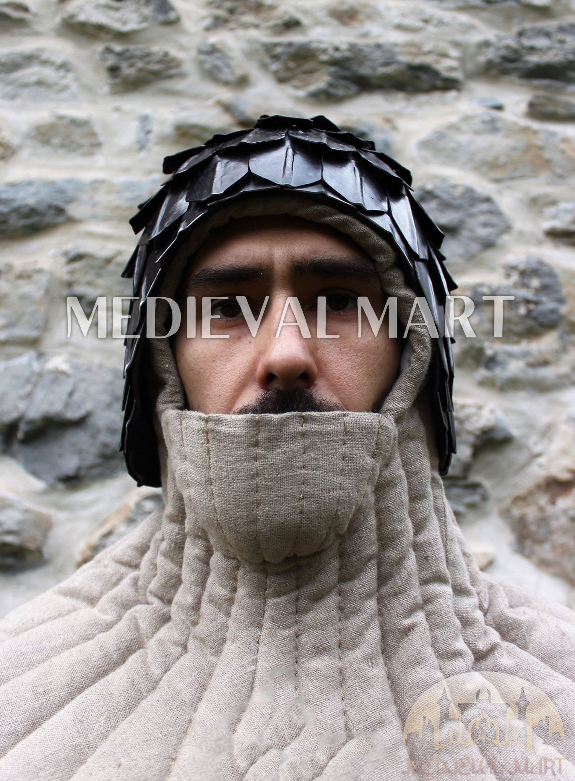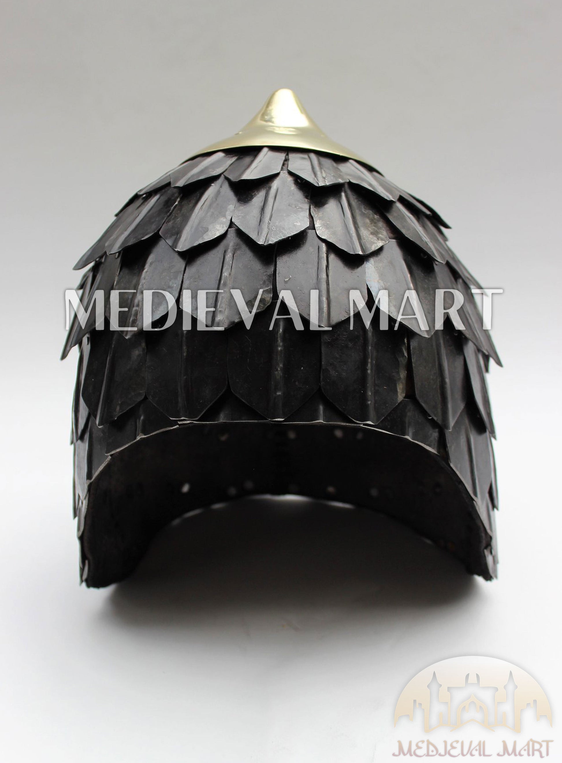 Forgé À La Main Avec Précision Et Fini Par Un Superbe Polissage Noir Antique, Ce Casque Reflète À La Fois Une Authenticité Robuste Et Un Charme Historique. Les Plaques À Écailles Chevauchantes Autour De La Calotte Offrent Une Durabilité Accrue Et Une Meilleure Résistance Aux Chocs, Faisant De Ce Casque Une Pièce Fiable Pour Les Reconstituteurs, Les Collectionneurs Et Les Guerriers LARP.