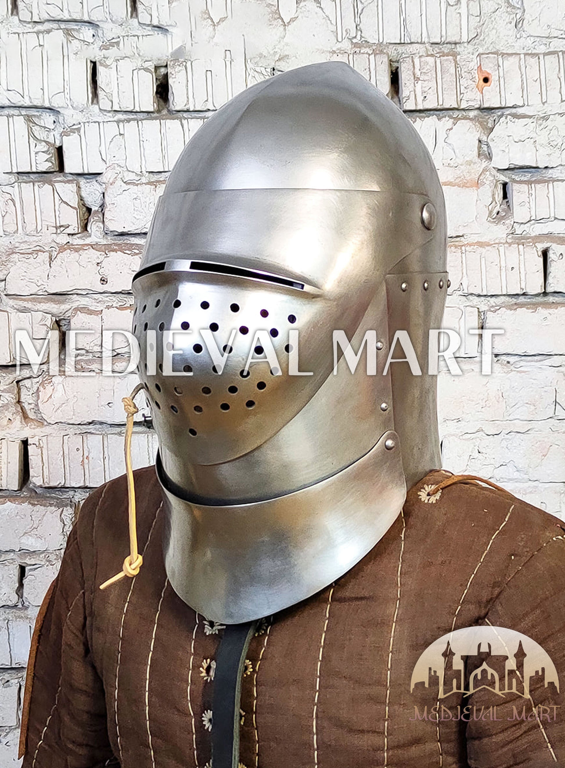 Entrez Dans La Puissance Blindée Du Champ De Bataille Anglais Du XVe Siècle Avec Le Casque Grand Bascinet « Sailsbury » MEDIEVALMART — Un Mélange Redoutable De Style Chevaleresque Et De Défense Brutale. Porté Par Les Chevaliers D’Élite Durant La Guerre De Cent Ans, Ce Casque Reflète L’Évolution De L’Armure Lors De L’Une Des Époques Les Plus Légendaires De La Guerre Médiévale.
