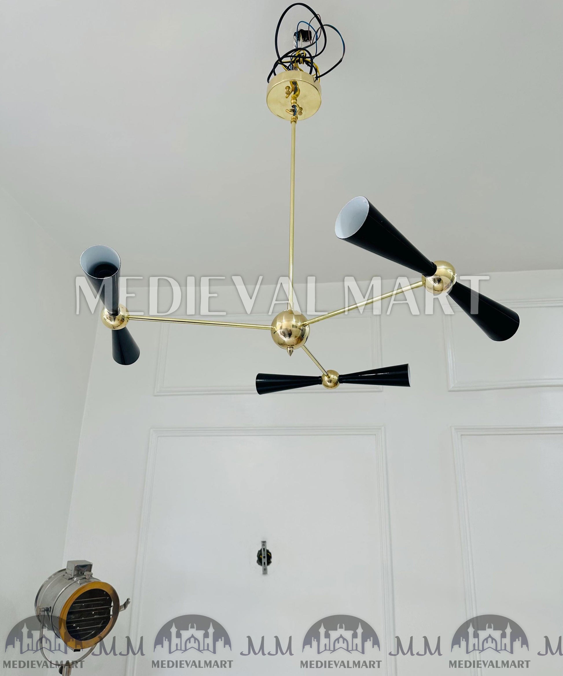 Apportez une élégance intemporelle et une géométrie audacieuse à votre intérieur avec le lustre Sputnik moderne en laiton MEDIEVALMART à 3 bras. Inspiré du design italien Stilnovo, ce luminaire artisanal capture parfaitement l’essence de l’éclairage Mid-Century Modern — lignes épurées, tons chaleureux et symétrie équilibrée.