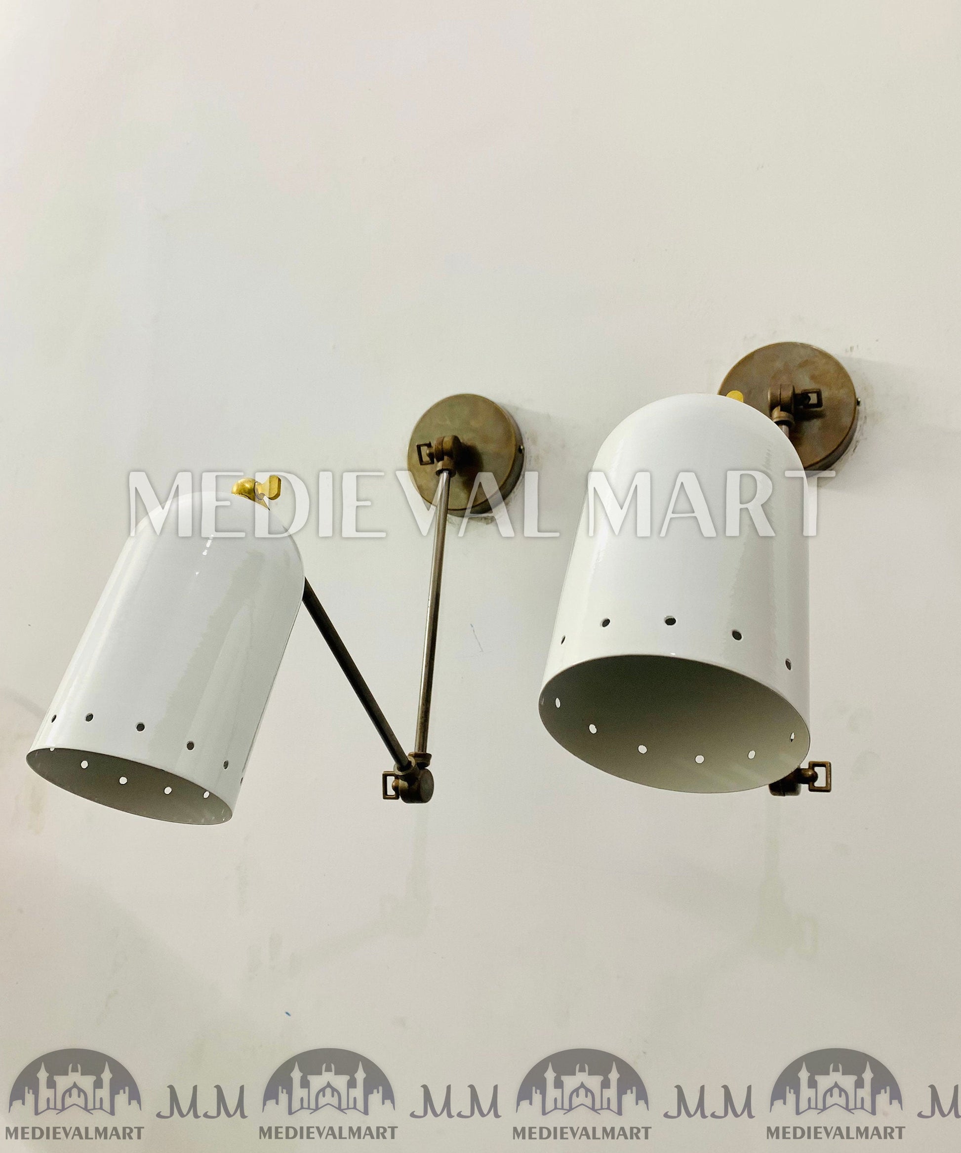 Apportez une élégance italienne intemporelle à votre intérieur avec la paire d’appliques murales Diabolo en laiton mid-century MEDIEVALMART. Inspirées de l’éclairage Stilnovo des années 1950, ces appliques fabriquées à la main présentent des abat-jour à double cône blancs épurés et une structure en laiton massif poli — idéales pour les murs de chevet, les couloirs ou les espaces de coiffeuse.