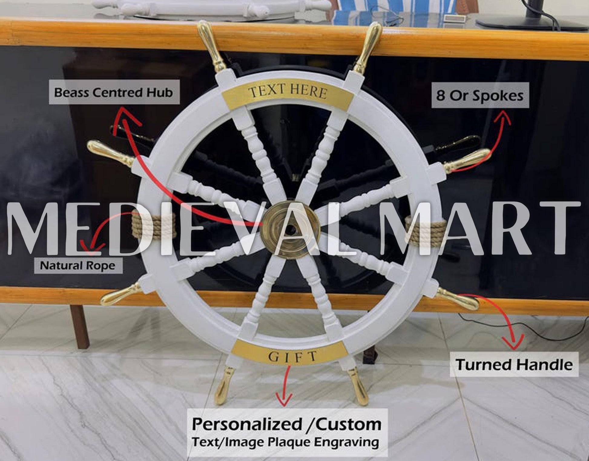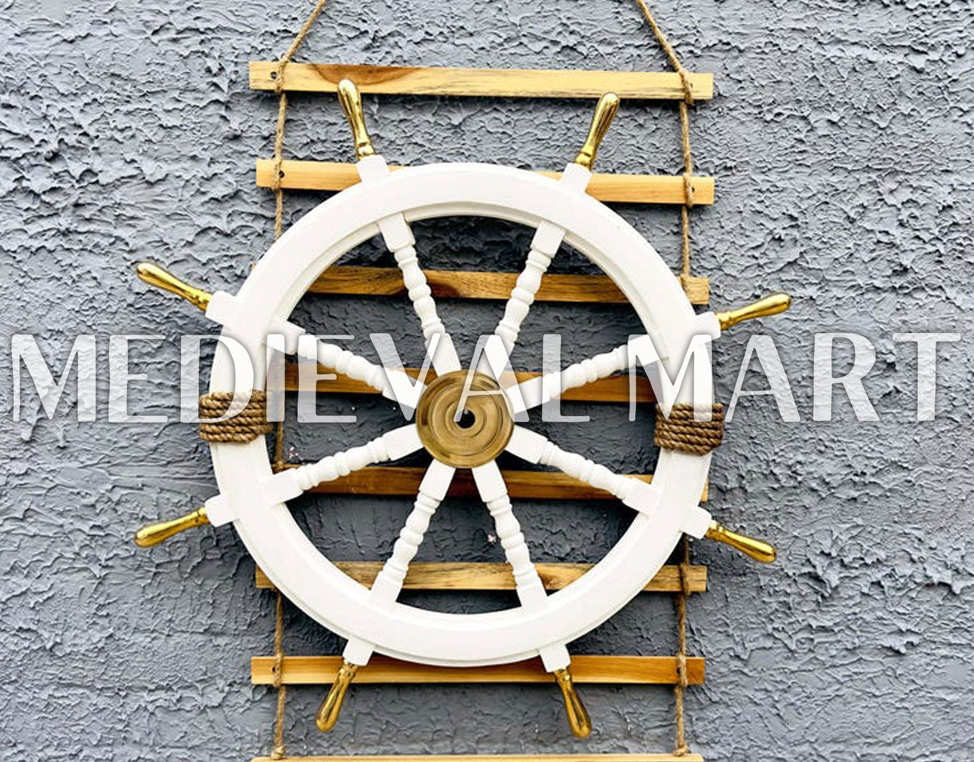 Apportez une touche d’élégance maritime à votre intérieur avec la Roue de Navire Nautique MEDIEVALMART en bois avec décoration en laiton et finition blanche. Fabriquée à partir de bois de haute qualité et sublimée par des accents en laiton poli, cette roue décorative incarne le charme intemporel des aventures en mer.