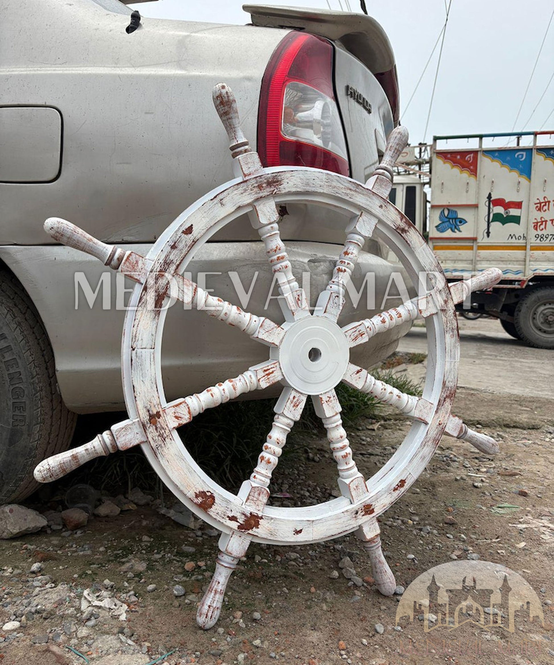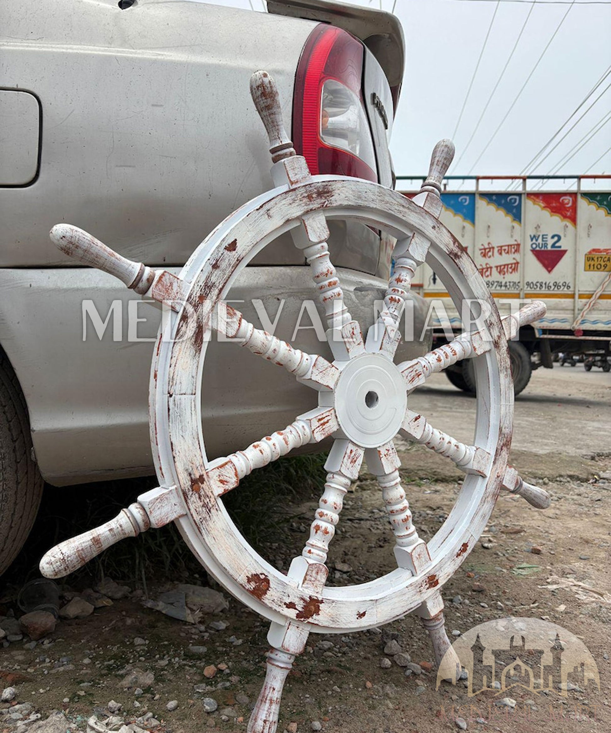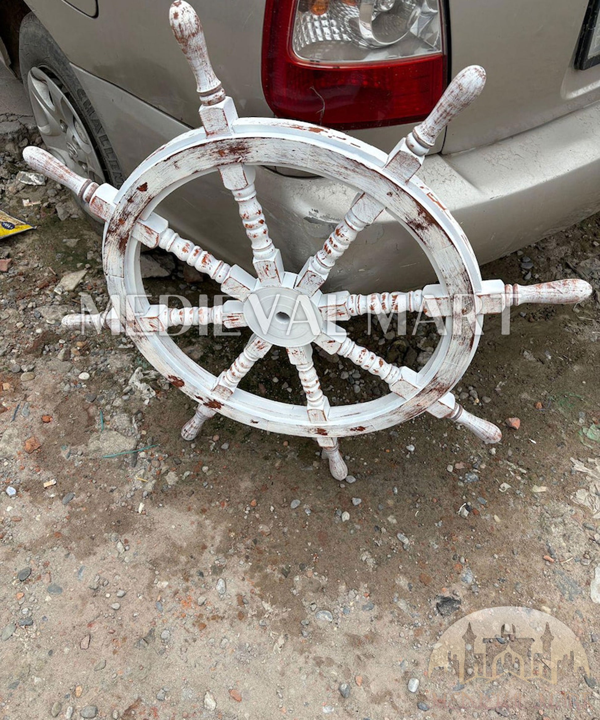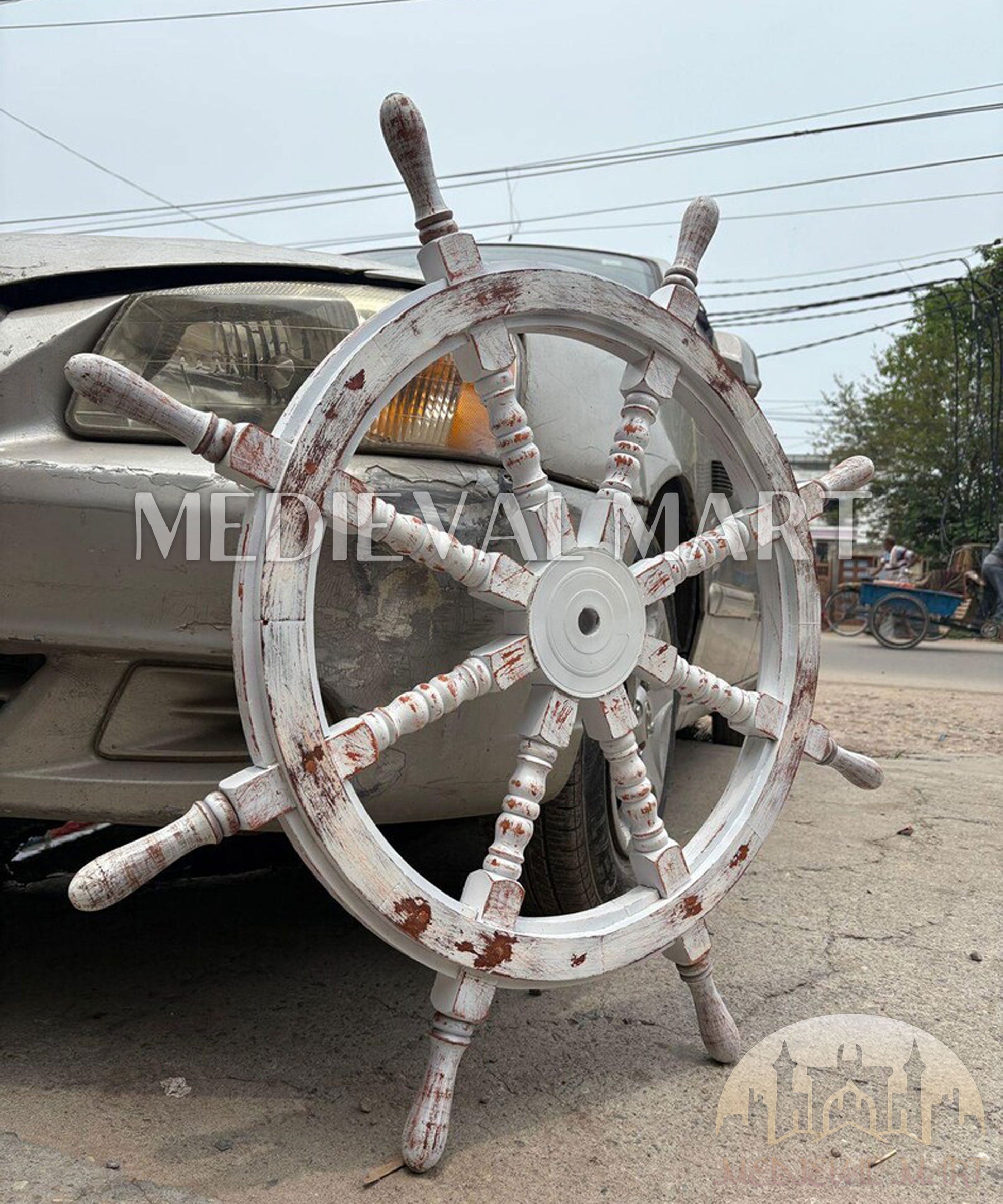 Apportez un charme maritime rustique à vos murs avec la roue de navire en bois blanc vieilli MEDIEVALMART. Conçue avec une finition volontairement patinée et usée, cette pièce décorative évoque l’authenticité des anciennes roues de gouvernail utilisées en mer.