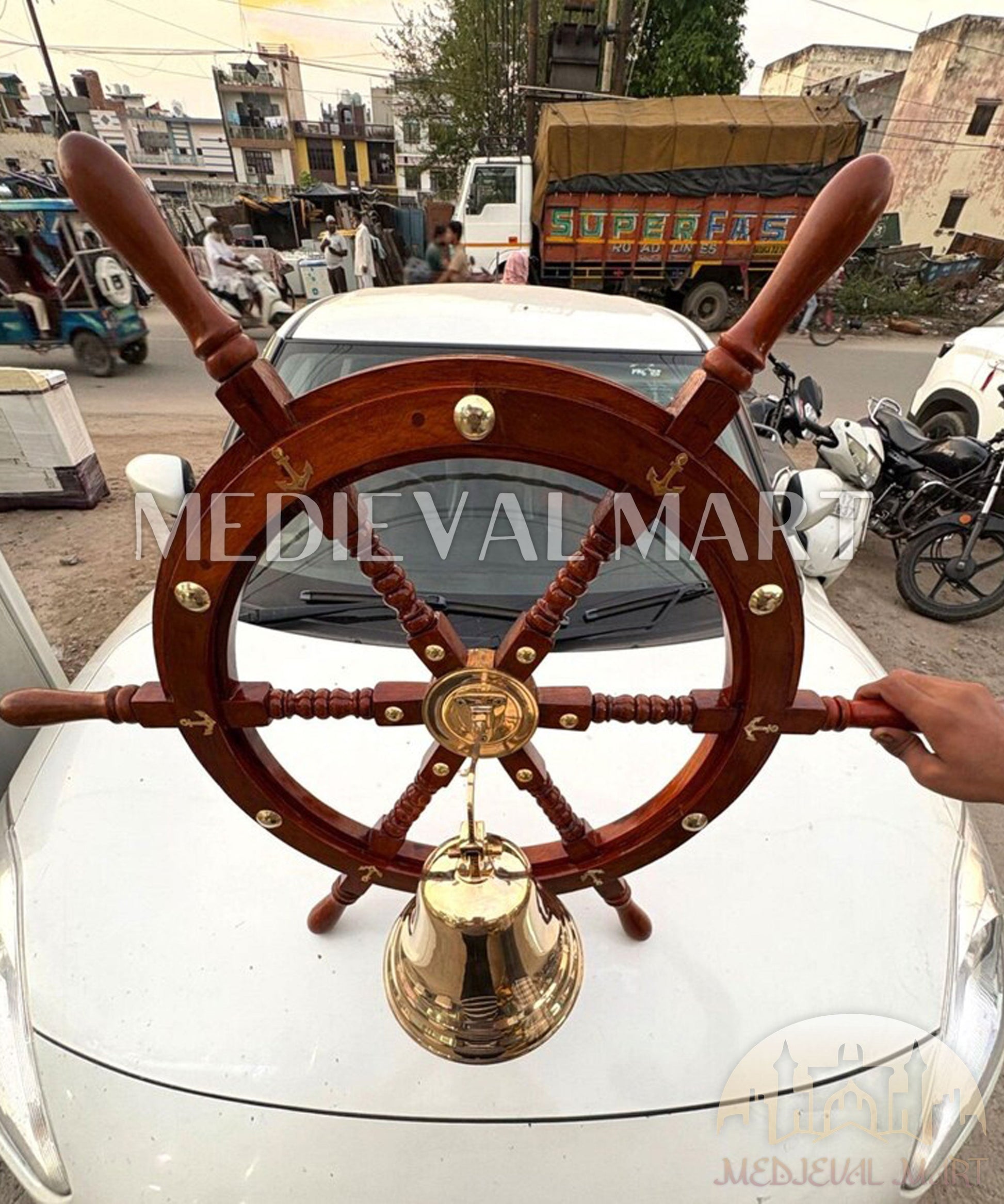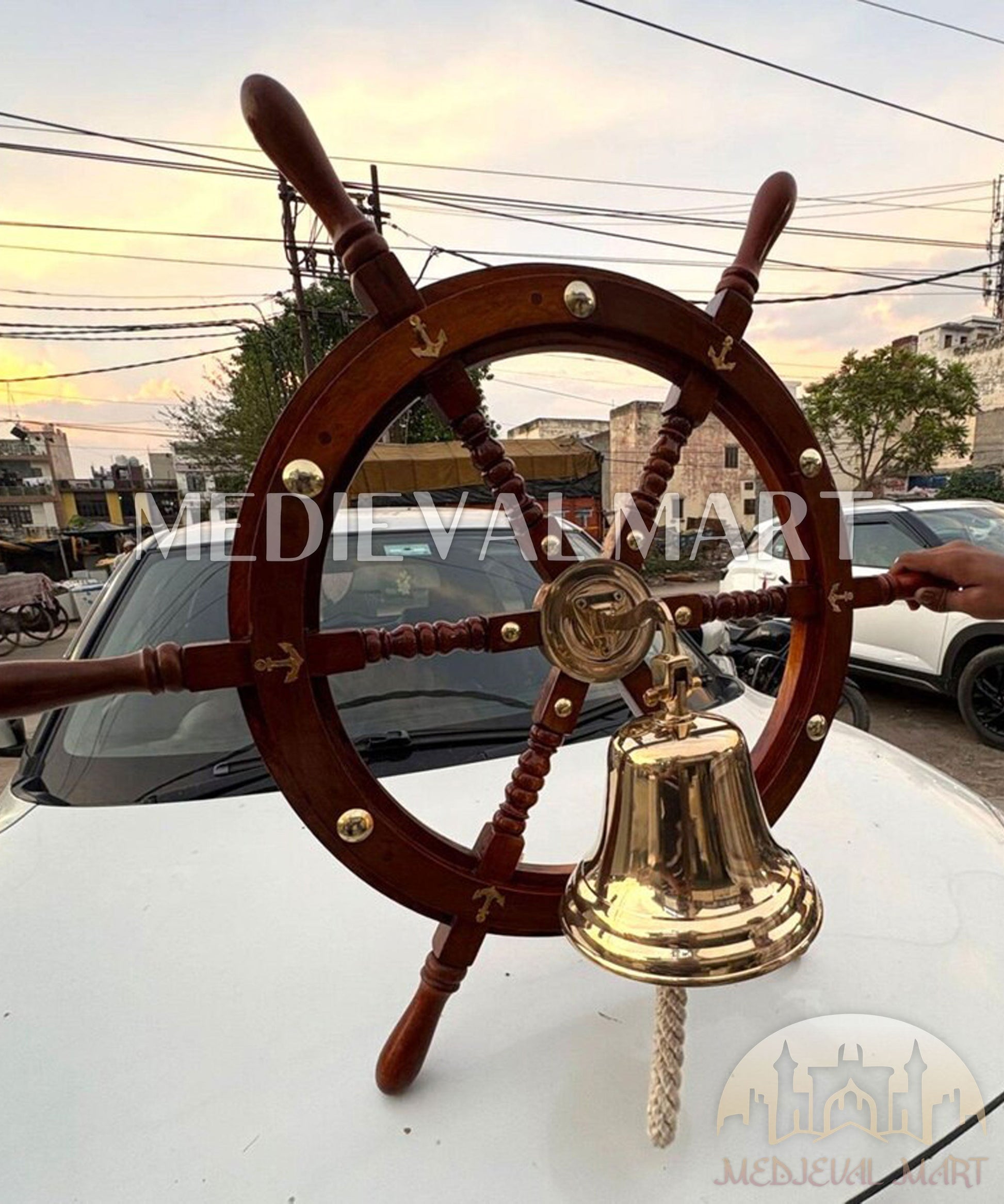 Apportez une véritable ambiance maritime à votre intérieur avec la roue de navire en bois marron MEDIEVALMART avec cloche en laiton. Fabriquée à la main avec un grand souci du détail, cette décoration murale associe la chaleur naturelle du bois poli à l’élégance intemporelle du laiton massif.